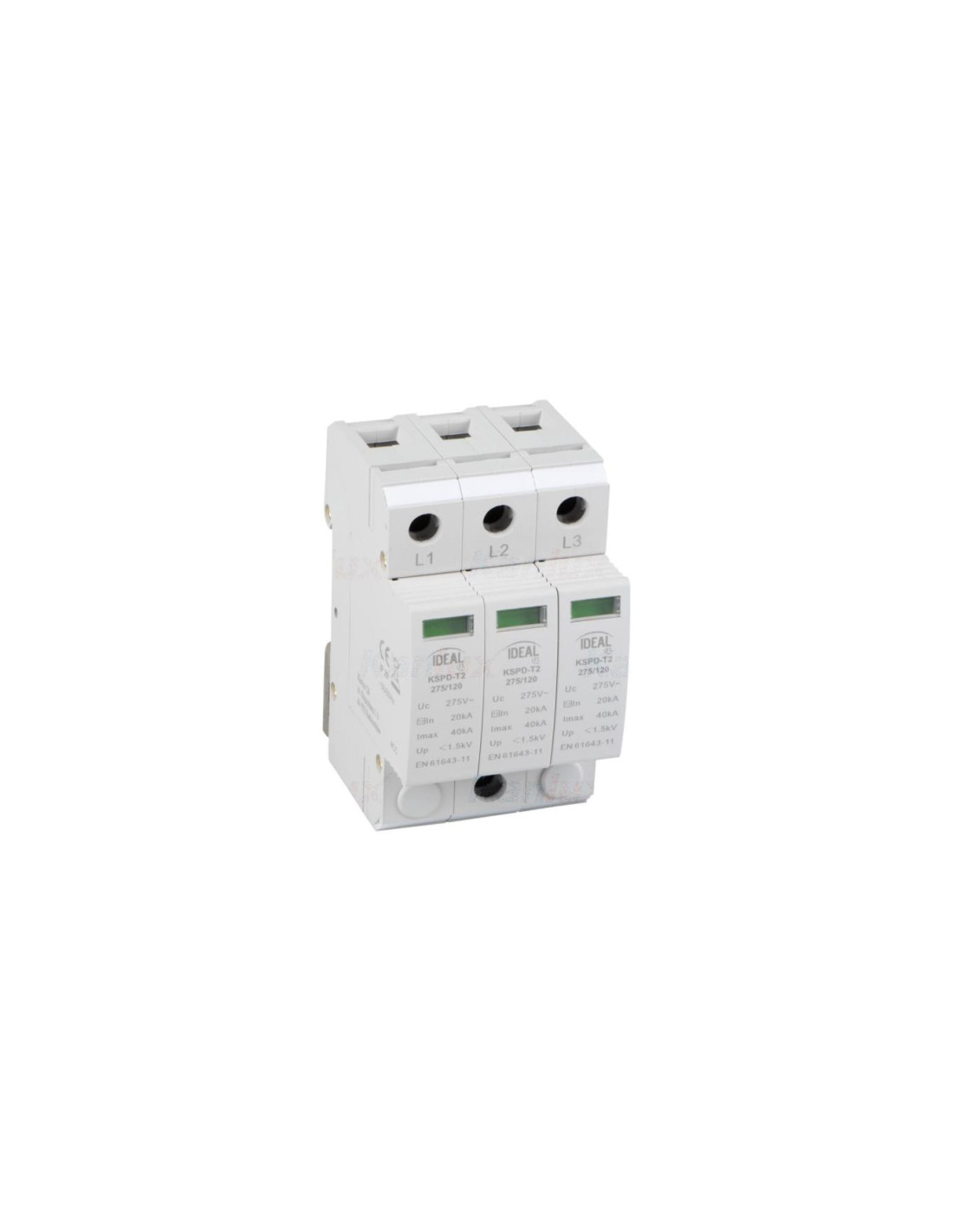 Ogranicznik przepięć, napięcie znamionowe 230V AC; częstotliwość znamionowa 50Hz; typ ochrony T2(C); liczba modułów: 3; największe napięcie stałej pracy U(c)=275V; największy prąd wyładowczy Imax=40kA; napięciowy poziom ochrony U(p)=1,5kV; parametry prądu szczątkowego I(pe)=30µA; przejściowy wzrost natężenia prądu Itrans= 20kA; IP20; znamionowy prąd wyładowczy In=20kA. Spełnia normę: PN-EN61643-1. Montaż: na szynę TH35.
