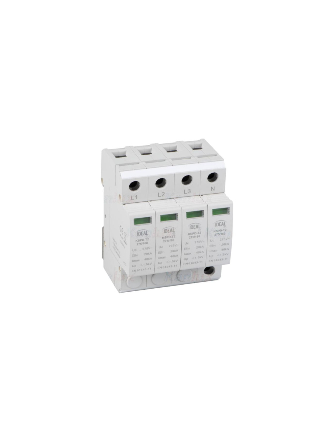 Ogranicznik przepięć, napięcie znamionowe 230V AC; częstotliwość znamionowa 50Hz; typ ochrony T2(C); liczba modułów: 4; największe napięcie stałej pracy U(c)=275V; największy prąd wyładowczy Imax=40kA; napięciowy poziom ochrony U(p)=1,5kV; parametry prądu szczątkowego I(pe)=30µA; przejściowy wzrost natężenia prądu Itrans= 20kA; spodziewany prąd zwarcia Lfi r.m.s.=100A; IP20; znamionowy prąd wyładowczy In=20kA. Spełnia normę: PN-EN61643-1. Montaż: na szynę TH35.