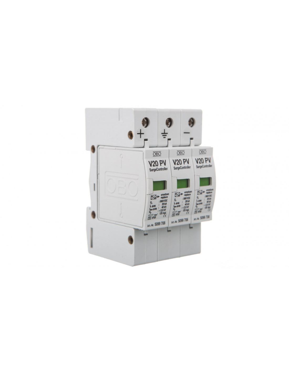 Ogranicznik przepięć PV 1000V DC Typ 2 C 3P 20kA 4kV V20-C 3-PH-1000 5094608 przeznaczony jest dla instalacji bez ochrony odgromowej lub z zachowanymi odstępami izolacyjnymi.