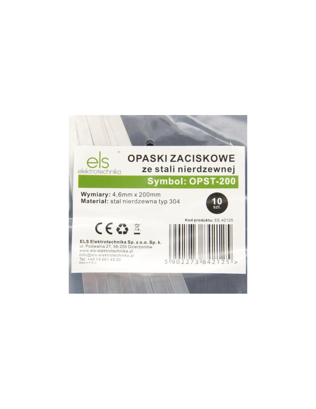 Opaska stalowa zaciskowa ball-lock ELS Elektrotechnika 4,6x200 opakowanie / 10 szt. Opaski zaciskowe stalowe z kulkowym mechanizmem blokującym (trytki, trytytki) umożliwiają szybkie łączenie wiązek kabli, przewodów, rurek czy węzłów. Znajdą zastosowanie wszędzie tam, gdzie wymagana jest duża wytrzymałość, niezawodność oraz precyzja. Z powodzeniem mogą być stosowane w różnych branżach, m. in. w motoryzacji, przemyśle chemicznym, na platformach wiertniczych, przemyśle stoczniowym i górniczym. Doskonale nadają się do mocowań wiązek przewodów elektrycznych, kabli, rurek i innych. Sprawdzą się także przy instalacji oświetlenia w teatrach, centrach wystawowych. Kulkowy mechanizm zaciskowy (stalowa kulka wewnątrz zatrzasku) blokuje opaskę po umieszczeniu jej końcówki w jego wnętrzu. Takie rozwiązanie stanowi niezwykle trwałe zamknięcie, ale także wpływa na szybkość i trwałość instalacji, gwarantując jednocześnie mocne i trwałe wiązanie kabla. Cechy: długość - 200 mm szerokość - 4,6 mm materiał - stal nierdzewna AISI304 maksymalna średnica opasania - 50 mm wytrzymałość na rozciąganie - 100 kg wysoka odporność na rozciąganie – 500N wyposażona w mechanizm samozaciskowy z wbudowaną stalową kulką odporna na działanie tłuszczy, olejów, promieniowania UV odporna na działanie czynników zewnętrznych możliwość skracania lub łączenia w celu osiągnięcia odpowiedniej długości możliwość zamykania opaski bez użycia narzędzi.