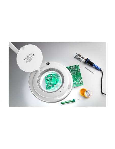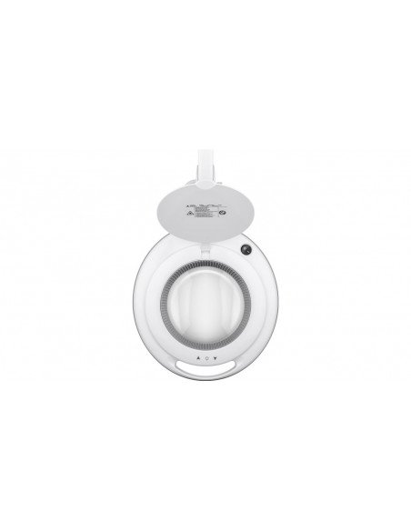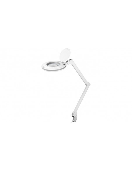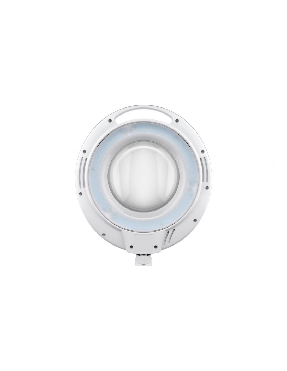Lampa zaciskowa z lupą o średnicy 127 mm i harmonijnym, białym oświetleniem pierścieniowym LED w świetle dziennym.