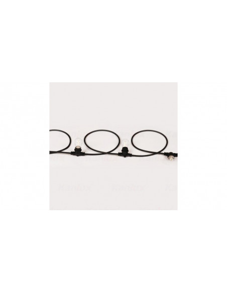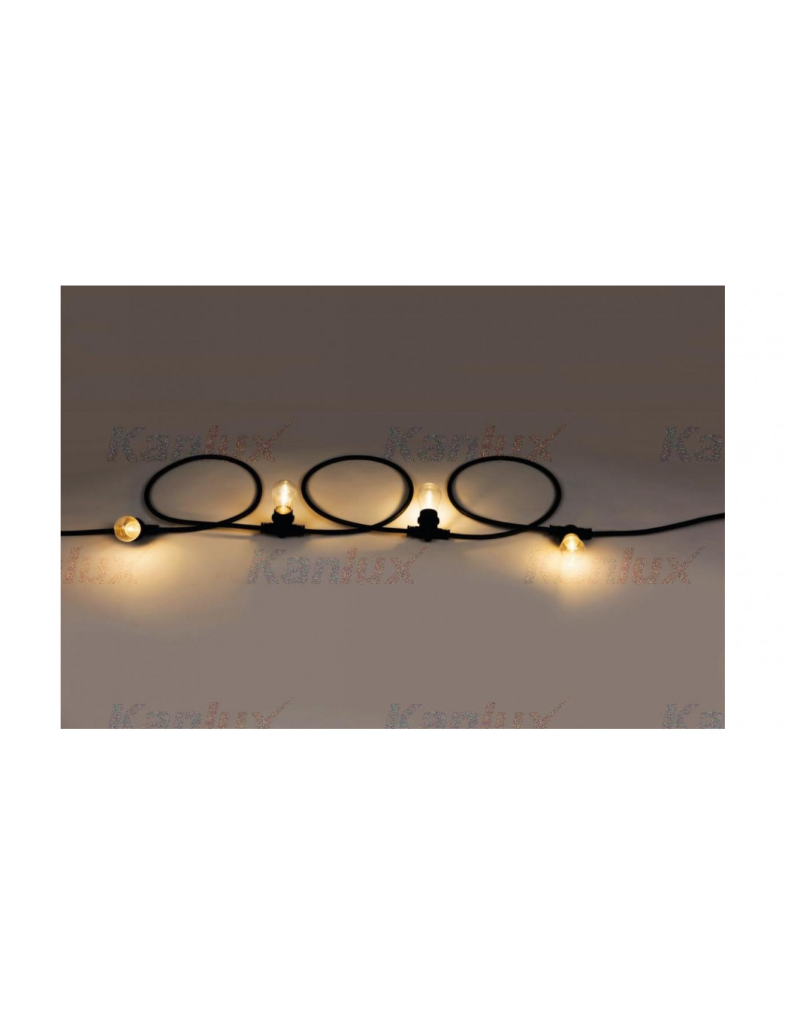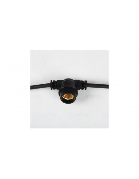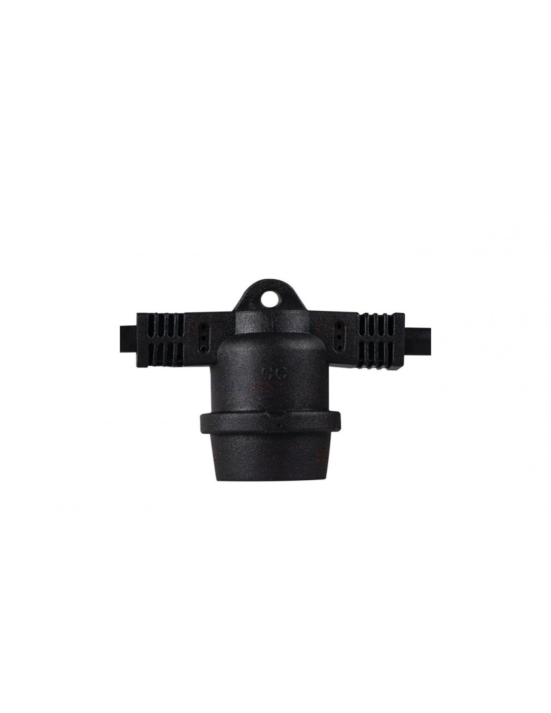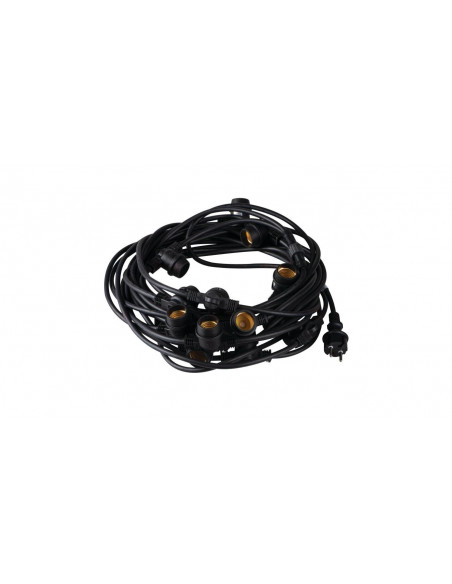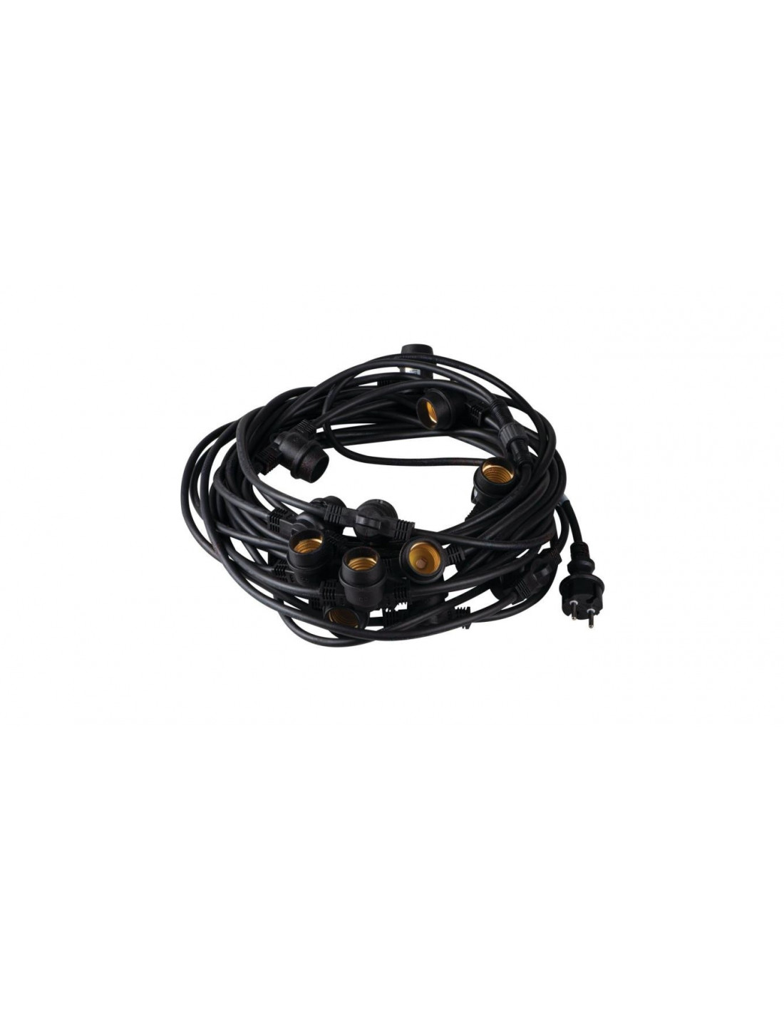 Grilanda świetlna do wewnątrz i na zewnątrz; do łączenia przelotowego; na wymienne źródło światła LED; trzonek E27; długość 15750mm; napięcie znamionowe 220-240AC; częstotliwość znamionowa 50Hz; moc maksymalna 15x max 10W; II klasa ochroności przed porażeniem elektrycznym; zakres temperatury otoczenia: -20°C do 40°C; przewód zakończony wtyczką; IP44; kolor czarny.
