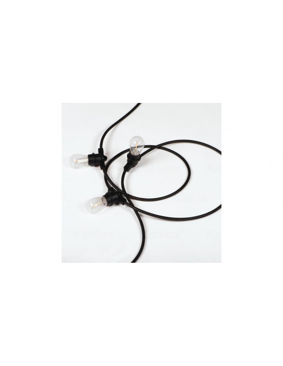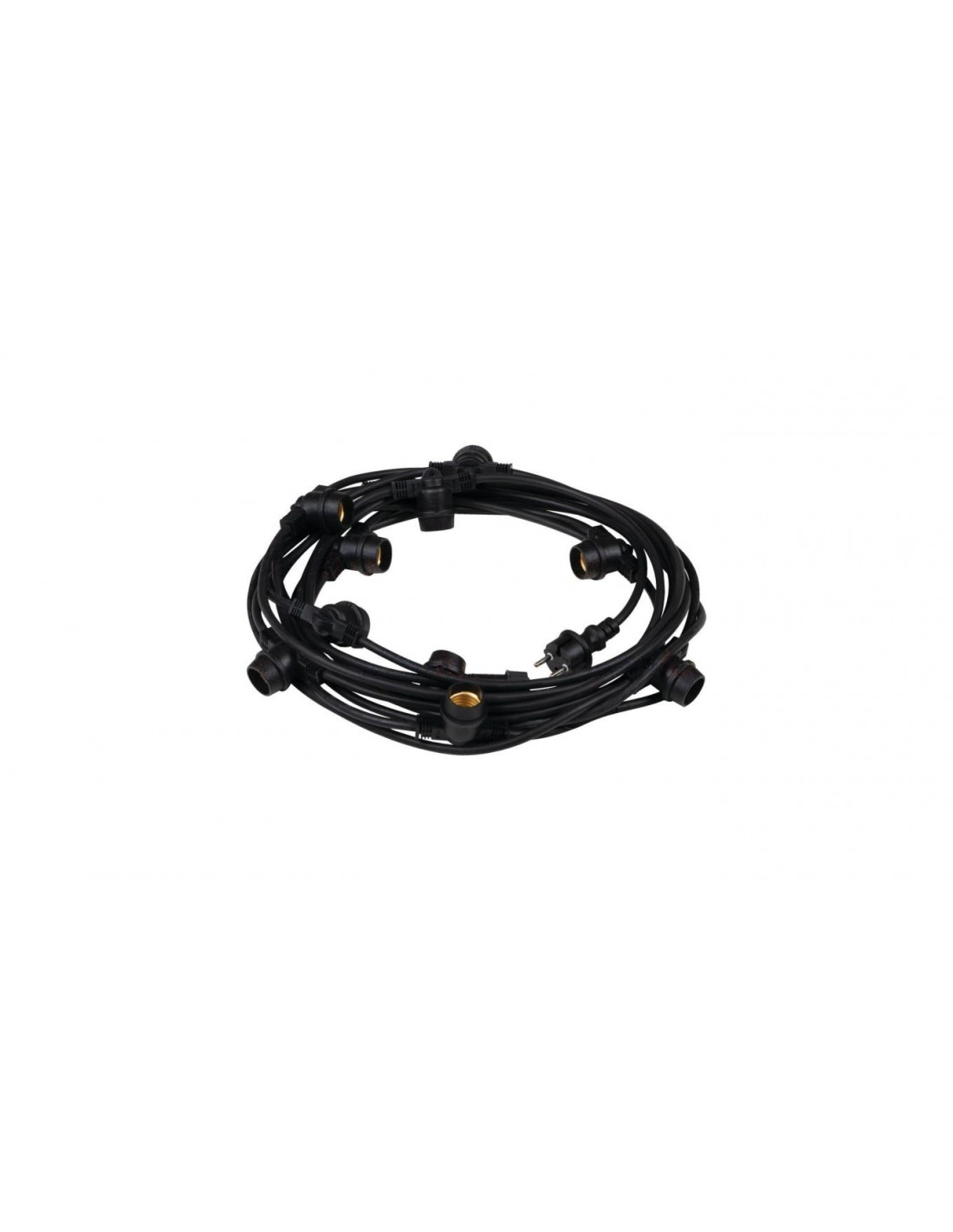 Grilanda świetlna do wewnątrz i na zewnątrz; do łączenia przelotowego; na wymienne źródło światła LED; trzonek E27; długość 11000mm; napięcie znamionowe 220-240AC; częstotliwość znamionowa 50Hz; moc maksymalna 10x max 10W; II klasa ochroności przed porażeniem elektrycznym; zakres temperatury otoczenia: -20°C do 40°C; przewód zakończony wtyczką; IP44; kolor czarny.
