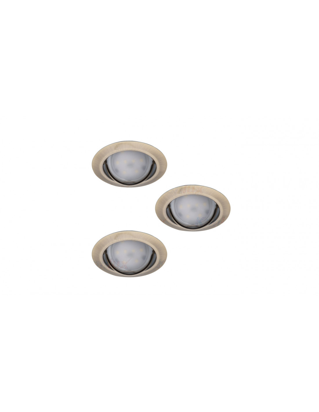 Zestaw 3 sztuk oczek składający się z: pierścieni dekoracyjnych (regulacja kątowa 50 stopni; materiał:stal; IP20; kolor: patynowany mosiądz; kształt: okrągły), źródeł światła (TOMIv2 GU10; 4,9W; 3000K; 400lm) i oprawek ceramicznych ze wspornikiem.