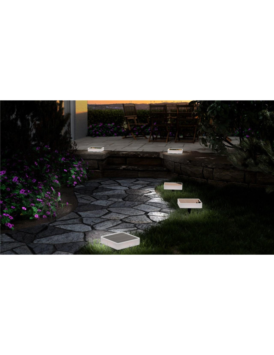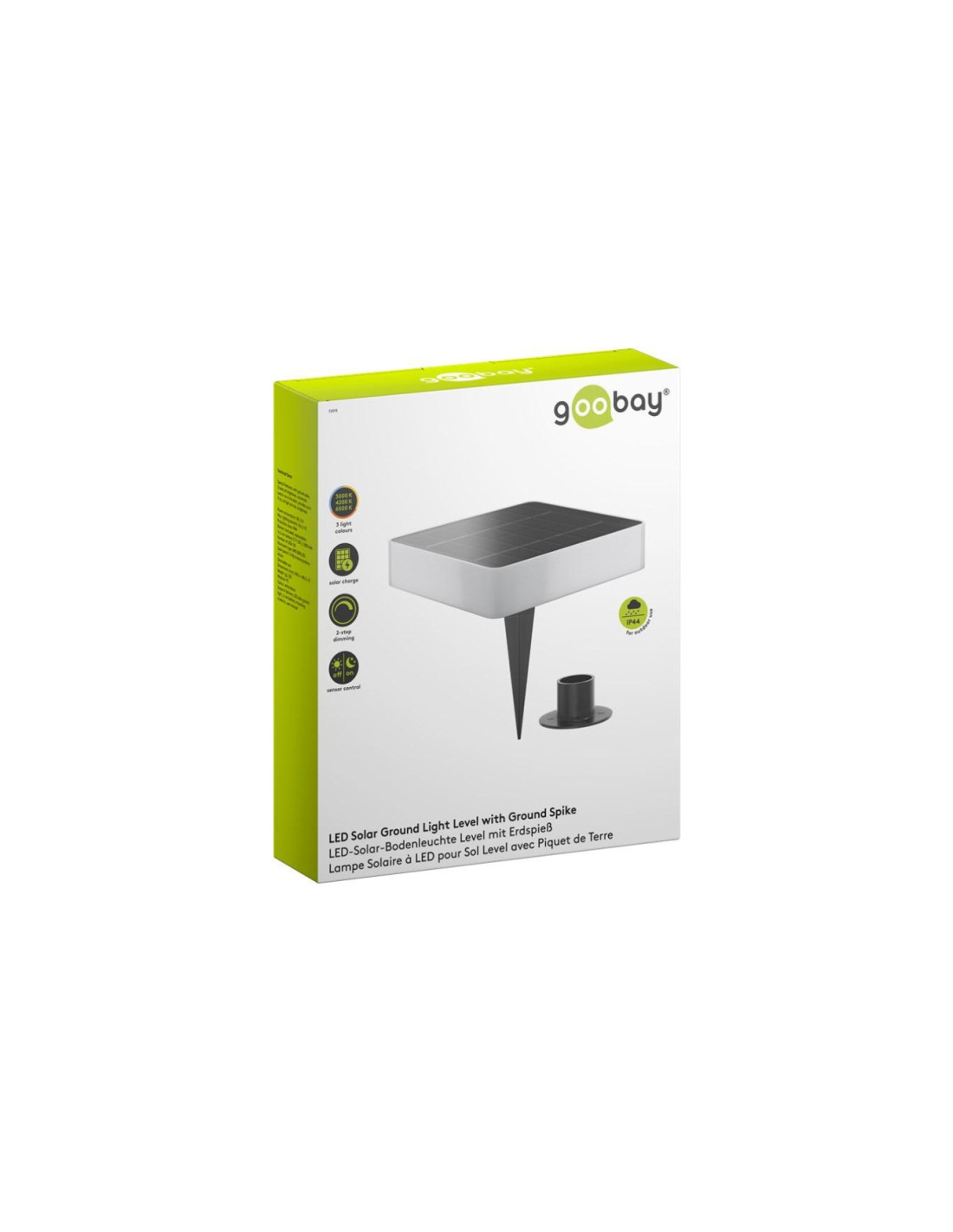 Może być umieszczona w ziemi za pomocą szpikulca lub przykręcona do solidnej powierzchni za pomocą dołączonej podstawy montażowej, np. na tarasach lub ścieżkach (wymiary światła: 141 x 141 x 32 mm)
