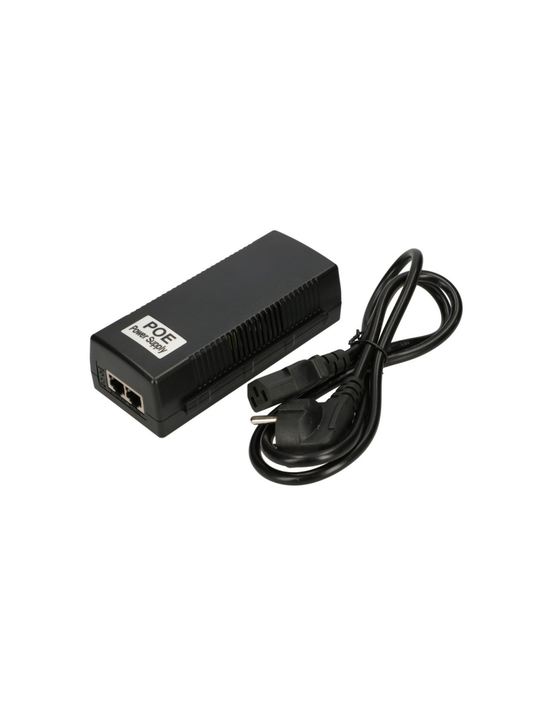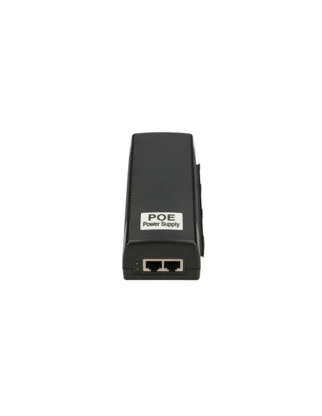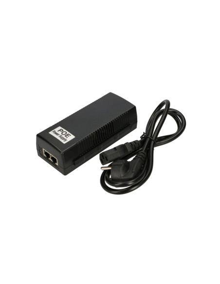 Zasilacz wyposażony jest w kabel zasilający o długości 1,2 metra zakończony złączem typu koniczyna oraz w dwa porty RJ45, do jednego podłącza się urządzenie, które ma być zasilane, a drugie gniazdo służy do podłączenia patchcordem switcha lub routera. Diode LED indicates the proper operation of the device. In case of activation of the overcurrent or overload protection, the PoE network power supply disconnects the voltage from the device, and after the failure is resolved, it automatically restores the voltage.