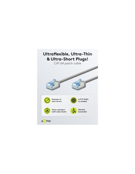 Ultra-elastyczny CAT 6A kabel krosowy, slim, U/FTP, szary bardzo krótkie wtyki, przewód z czystej miedzi (CU), LSZH, płaszcz TPE, AWG 32 CATegoria sama dla siebie: Super cienkie kable CAT z bardzo krótkimi złączami drastycznie zmniejszają objętość materiału w szafach serwerowych i panelach krosowych - dla znacznie lepszej cyrkulacji powietrza i mniejszego gromadzenia się ciepła niż w przypadku konwencjonalnego okablowania. Ponadto, miękki płaszcz TPE i cienkie miedziane przewodniki zapewniają wyjątkową elastyczność i wydajność materiałową, które sprawiają, że ta generacja kabli jest idealnym partnerem sieciowym. Supercienki kabel LAN z bardzo krótkimi złączami RJ45 zapewnia mniejszą objętość kabla w szafie serwerowej lub panelu krosowym, a tym samym optymalną cyrkulację powietrza Bezpieczny i elastyczny: Bez ekranowania skrętki i z bezhalogenową, niskodymną osłoną TPE zapewniającą szczególnie mały promień gięcia i wysoką elastyczność Dzięki AWG 32 i średnicy zewnętrznej 3,8 mm, kabel jest bardzo cienki, ale tak samo wydajny jak standardowy kabel CAT Kabel sieciowy CAT 6A jest idealny do szybkich połączeń, takich jak 10 Gigabit Ethernet 10GBASE-T, 100BASE-TX, 1000BASE-T i 10/100/1000/10000 Mbit/s Kabel RJ45 jest odpowiedni do zasilania przez sieć Ethernet (PoE, PoE+) i testowany pod kątem CAT 6A (dostarczany z indywidualnym protokołem pomiarowym) Wysokiej jakości przewodnik miedziany (CU) i pozłacane styki zapewniają niską rezystancję transmisji i zapobiegają korozji Skuteczne, kompaktowe zabezpieczenie przed załamaniem jest odporne na przerwanie kabla i zapewnia długą żywotność kabla Ethernet Produkty są oznakowane tylko papierową etykietą, nie stosuje się plastikowych torebek i plastikowych opasek kablowych. Zgodność z obowiązującymi normami IEC i ISO: IEC 60332-1: Trudnopalny, IEC 61034: Niski poziom dymu IEC 60754-2: Bezhalogenowy ISO 11801: Wydajność test kanału Fluke: kanał + PoE