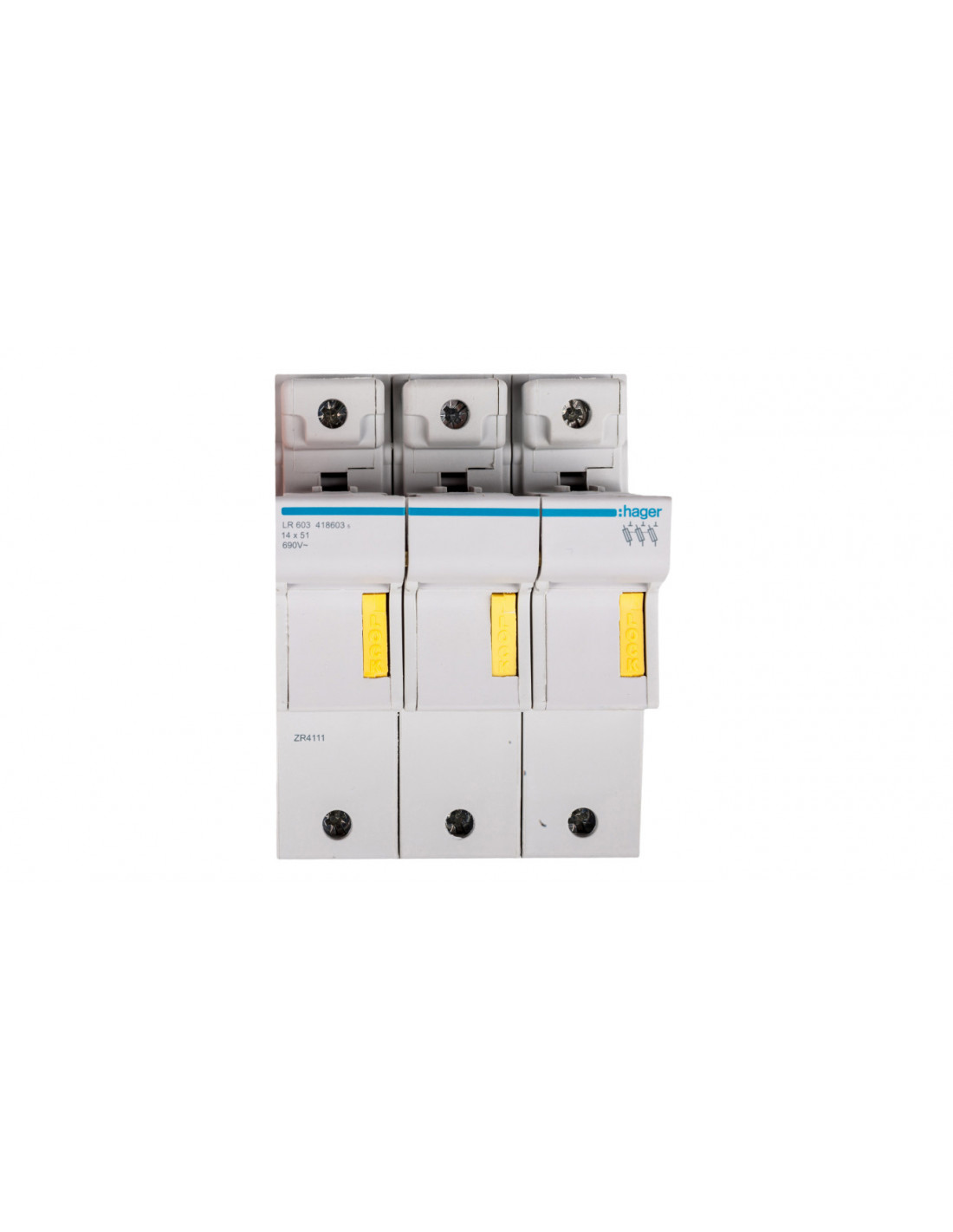 Rozłącznik cylindryczny pochodzi z serii produktów LR, posiada 3 bieguny i jest przeznaczony do bezpieczników o wymiarach 14x51 mm.