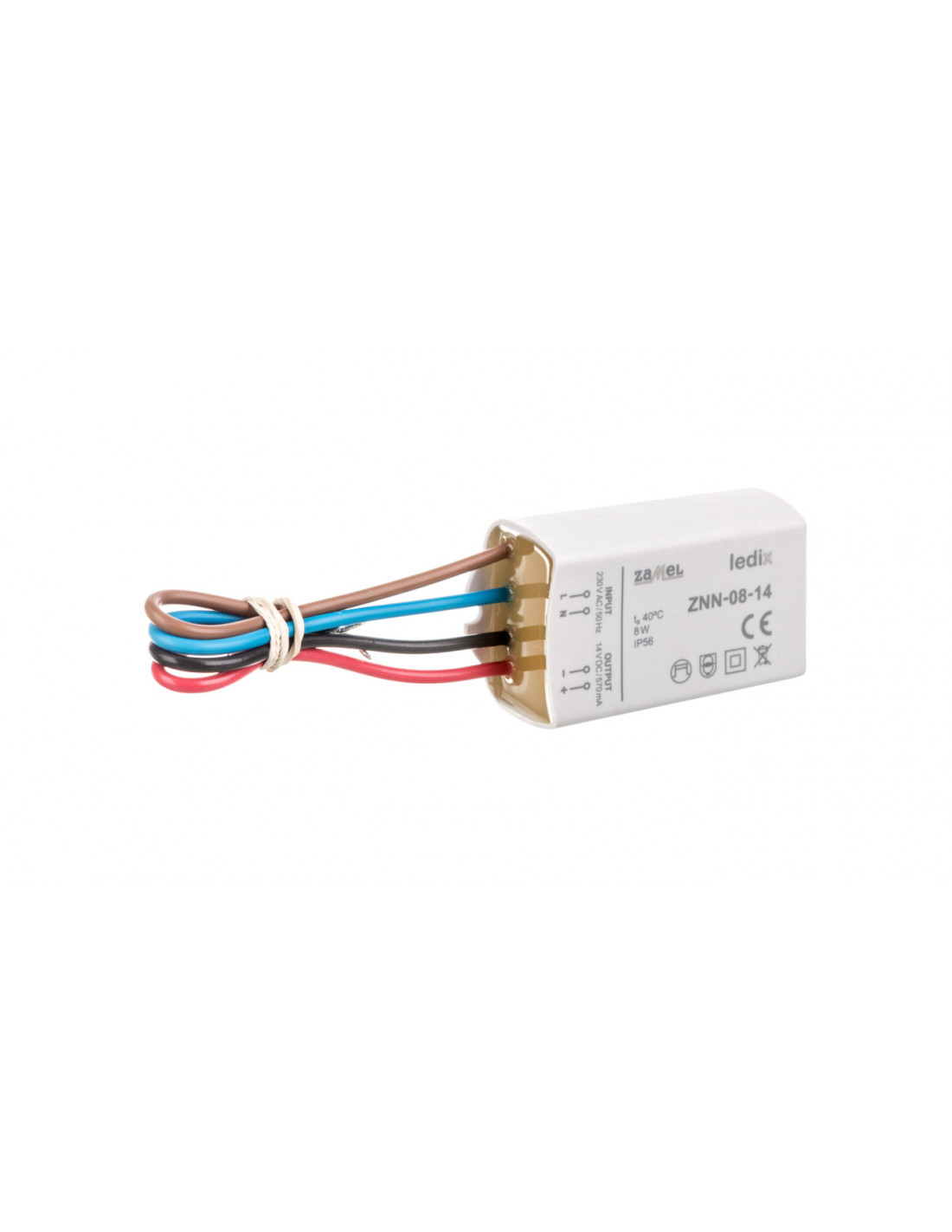 Zasilacz ZNN-08-14 to profesjonalny zasilacz impulsowy o stabilizacji napięciowej 14 V DC. Przeznaczony jest do montażu natynkowego. Znamionowa moc wyjściowa wynosi 8 W. Zasilacz rekomendowany jest do zasilania opraw oraz osprzętu należącego do grupy LEDIX. Produkt posiada zabezpieczenia przeciwzwarciowe oraz przeciążeniowe, które zwiększają bezpieczeństwo jego użytkowania. Wysoka sprawność oraz bardzo mały pobór mocy w trybie czuwania sprawiają, iż jest to rozwiązanie bardzo ekonomiczne, przeznaczone do pracy ciągłej. Zasilacz spełnia wymagania norm zharmonizowanych.
