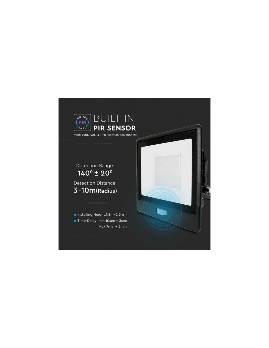Zaprojektowana z myślą o wygodnym wykorzystaniu. Nowoczesny Czujnik PIR Zasięg detekcji wynosi od 3 do 10 metrów. Opóźnienie jest regulowane i może wynosić od 10 sekund do 7 minut.