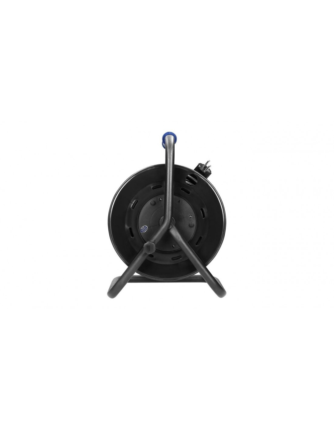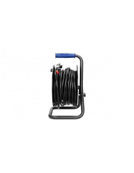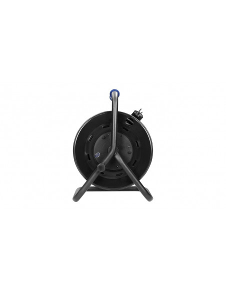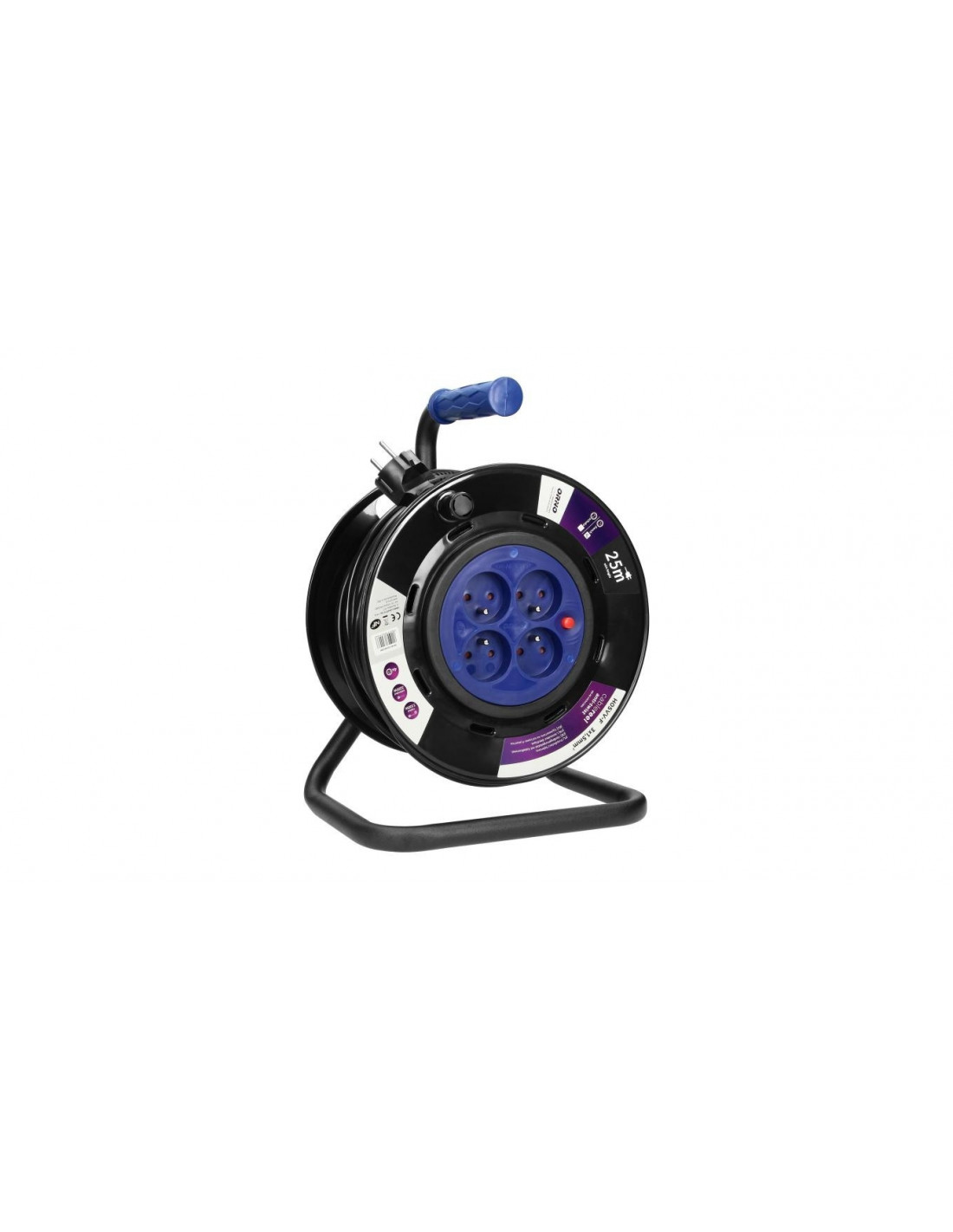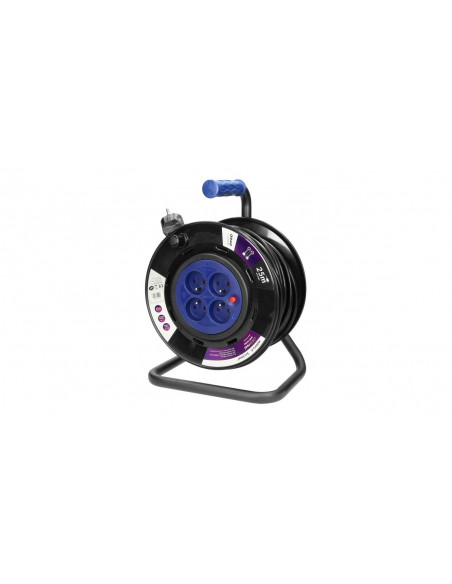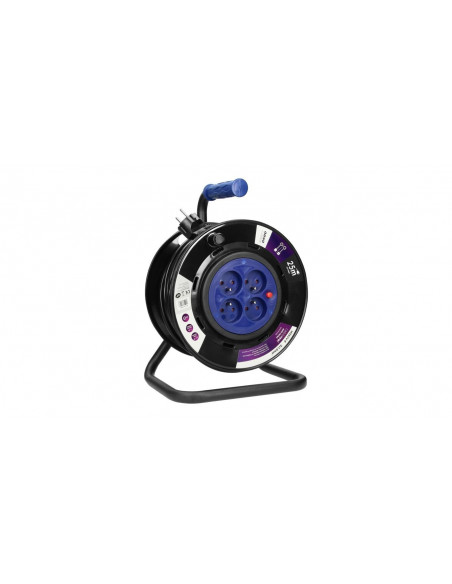 Przedłużacz na zwijanym bębnie z innowacyjnym systemem anti-twist (stałe gniazda) oraz zabezpieczeniem przeciążeniowym w postaci wyłącznika termicznego. Posiada 4 gniazda sieciowe z uziemieniem, przesłonami torów prądowych, wygodny, gumowy uchwyt do przenoszenia, obracający się uchwyt do zwijania kabla, blokadę obrotu bębna oraz wtyczkę zalewaną IP44. Przystosowany do ciężkich warunków użytkowania np. do warsztatu, na budowę itp.
