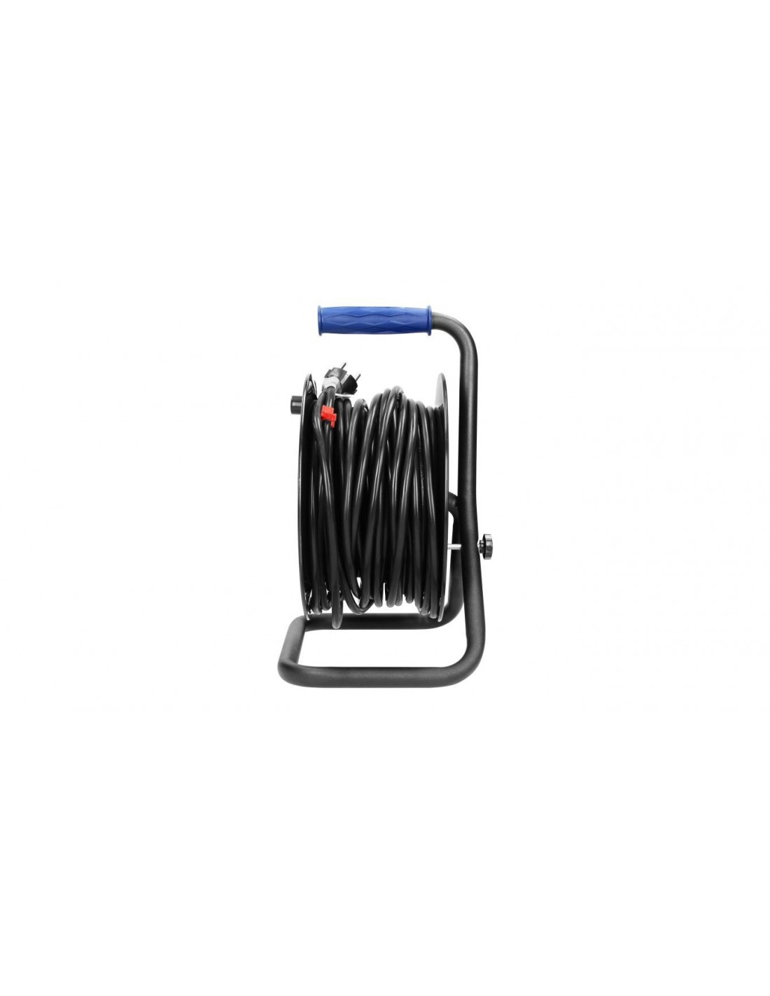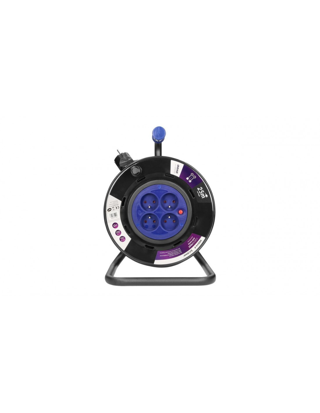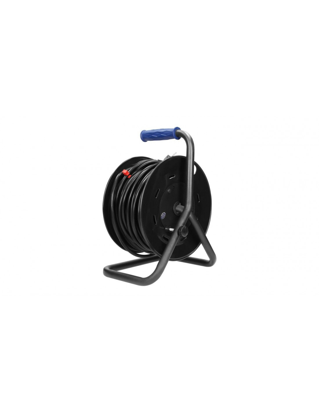 Przedłużacz na zwijanym bębnie z innowacyjnym systemem anti-twist (stałe gniazda) oraz zabezpieczeniem przeciążeniowym w postaci wyłącznika termicznego. Posiada 4 gniazda sieciowe z uziemieniem, przesłonami torów prądowych, wygodny, gumowy uchwyt do przenoszenia, obracający się uchwyt do zwijania kabla, blokadę obrotu bębna oraz wtyczkę zalewaną IP44. Przystosowany do ciężkich warunków użytkowania np. do warsztatu, na budowę itp.