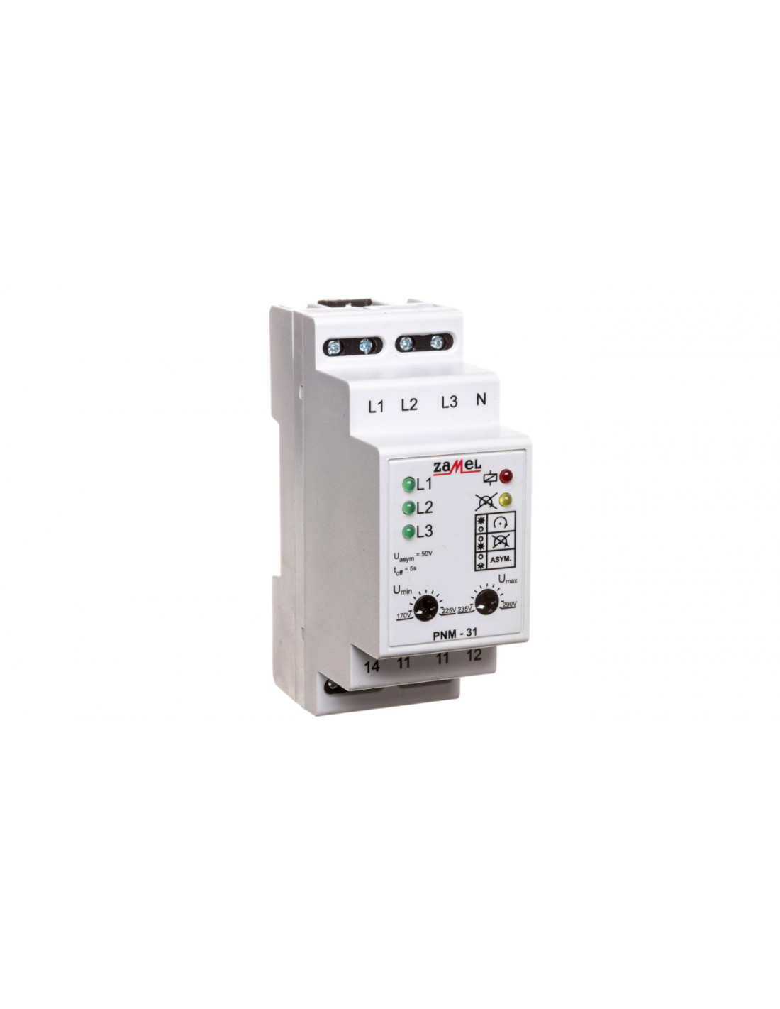 Przekaźnik napięciowy PNM-31 służy do kontroli wartości napięcia w sieci trójfazowej w celu zabezpieczenia odbiornika przed wzrostem lub spadkiem napięcia poza nastawione wartości minimalną i maksymalną. Przekaźnik posiada stały czas opóźnienia wyłączenia (ok. 5 s). Urządzenie wykrywa również złą kolejność faz oraz asymetrię napięcia.