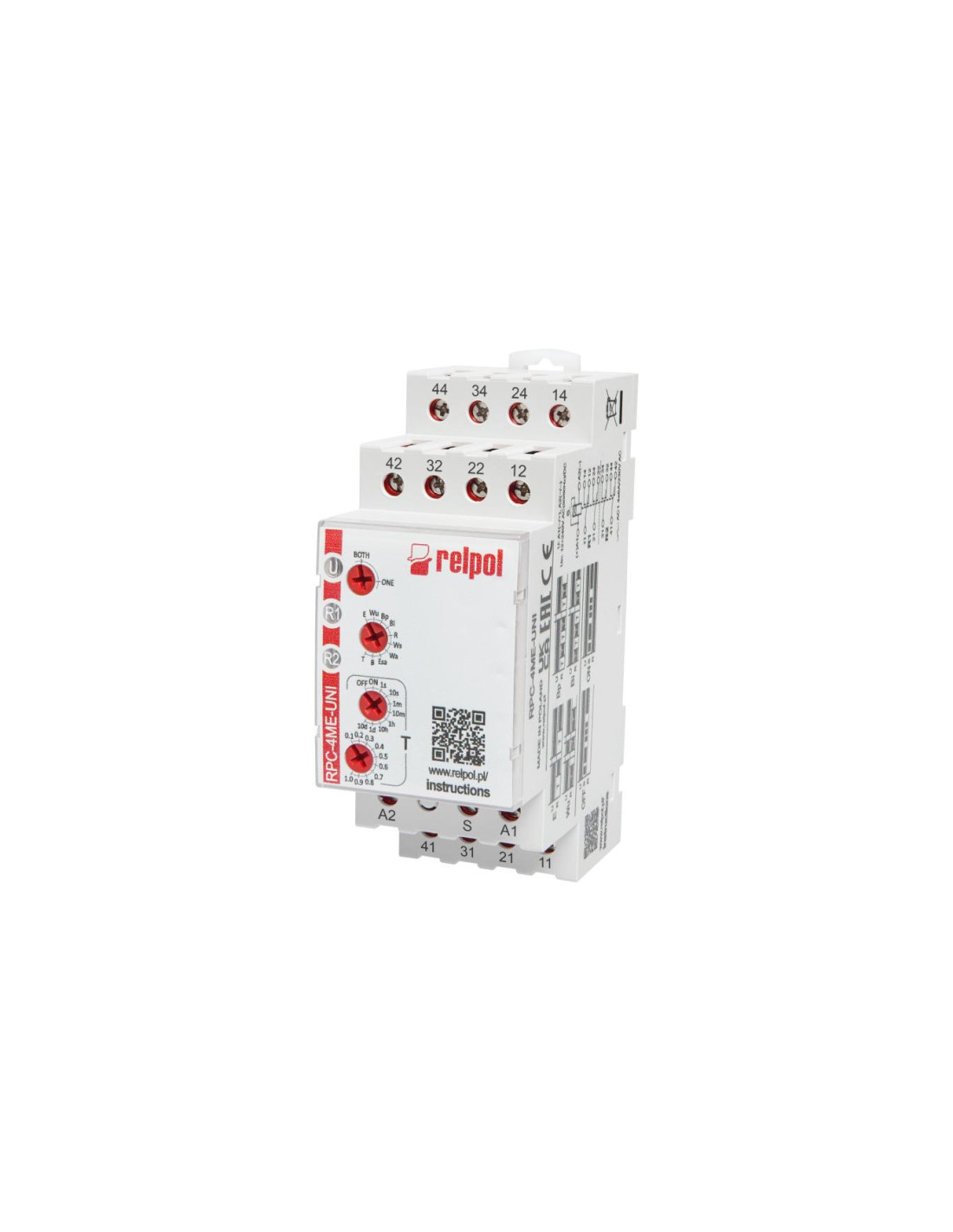 Przekaźnik czasowy - 4 wyjścia stykowe 2 x 2P. Napięcie zasilania - uniwersalne: 12...240VAC/DC 50/60 Hz . Wielofunkcyjne 10 funkcji czasowych; 8 zakresów czasowych. Tryb pracy ONE i BOTH. Szerokość 35 mm.