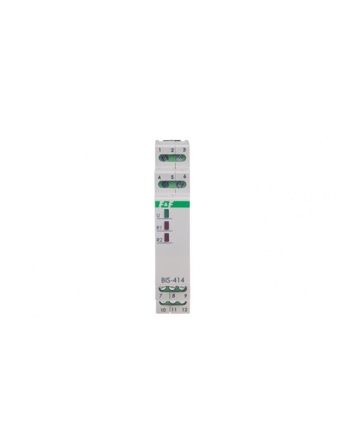 Zasilanie przekaźnika bistabilnego sygnalizowane jest świeceniem zielonej diody U. Przekaźnik świecznikowy posiada dwa oddzielne wyjścia R1 i R2, których załączenie sygnalizowane jest świeceniem czerwonych diod R1 i R2. Stan wyjść wymuszany jest sekwencyjnie za pomocą łącznika chwilowego (dzwonkowego) podłączonego do wejścia sterującego. Po zaniku napięcia zasilania stan styków jest resetowany.