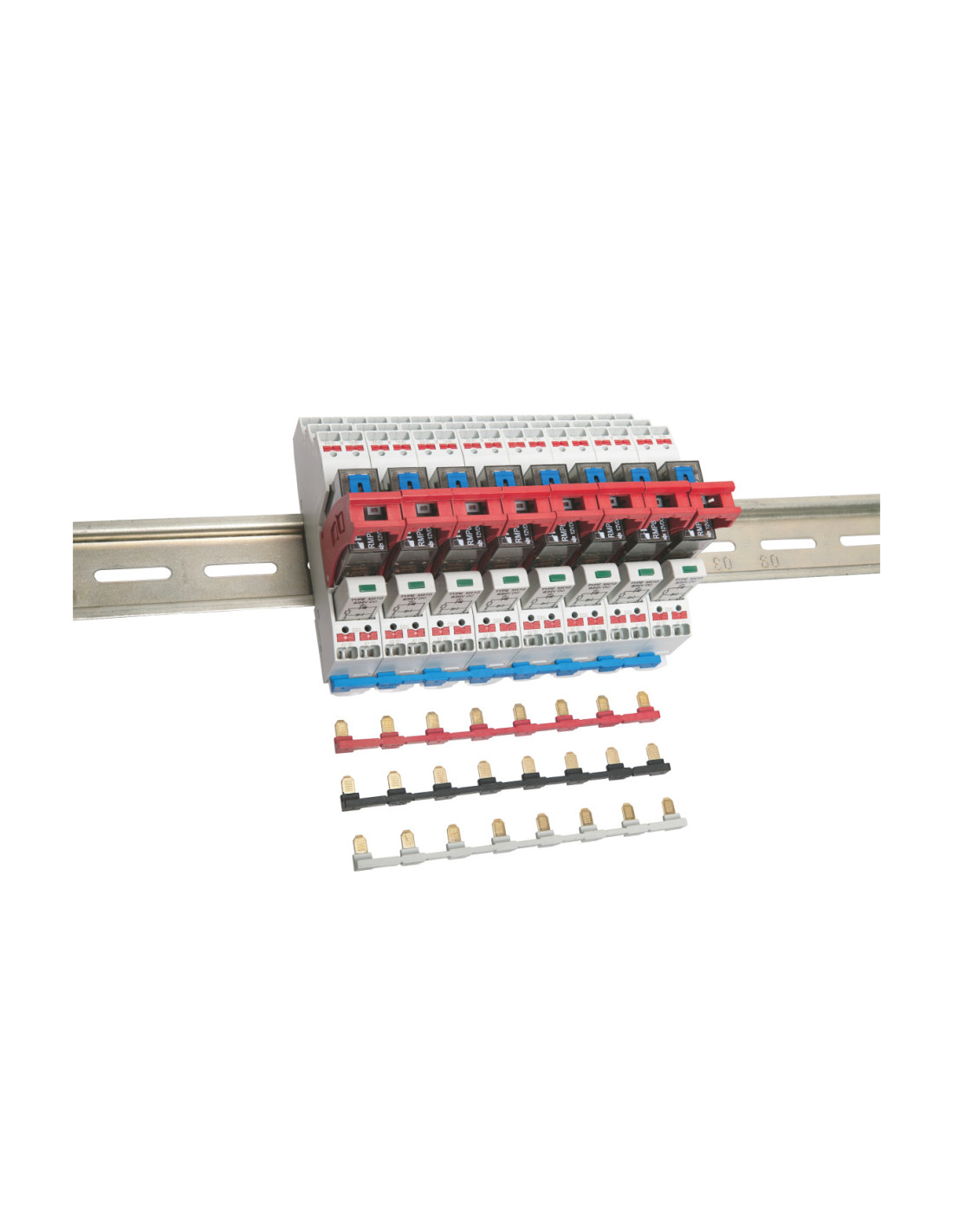 Złącza 2-polowe ZGZP80-2: swobodne mostkowanie wspólnych potencjałów zasilania oraz zacisków po stronie zestyków, tworzenie równoległych połączeń wyjść w systemach redundatnych. ZGZP80-2 szary , ZGZP80-2BK czarny , ZGZP80-2RD czerwony , ZGZP80-2BE niebieski