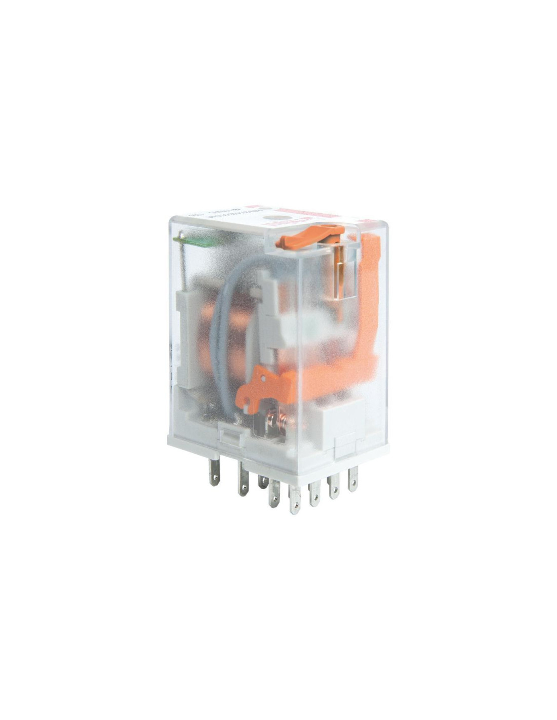 Przekaźnik elektromagnetyczny, przemysłowy - miniaturowy, do gniazda wtykowego. Szerokość 21,2 mm. Wyjście: 4P - cztery zestyki przełączne - wyprowadzenia: 11(9)-12(1)-14(5); 21(10)-22(2)-24(6); 31(11)-32(3)-34(7); 41(12)-42(4)-44(8); AC1 - 6 A / 250 V; DC1 - 6 A / 24 V. Wejście / cewka - wyprowadzenia: A1(13) - A2(14), napięcie zasilania Un - 110 V AC. Wskaźnik mechaniczny W i przycisk testujący T z funkcją blokowania. Wymiary: 27,5 x 21,2 x 35,6 mm. IP 40. Materiał styków: AgNi. Pasujące gniazda: GZT4, GZM4, GZ4, GS4, GZP4, SU4D, SU4L, G4.
