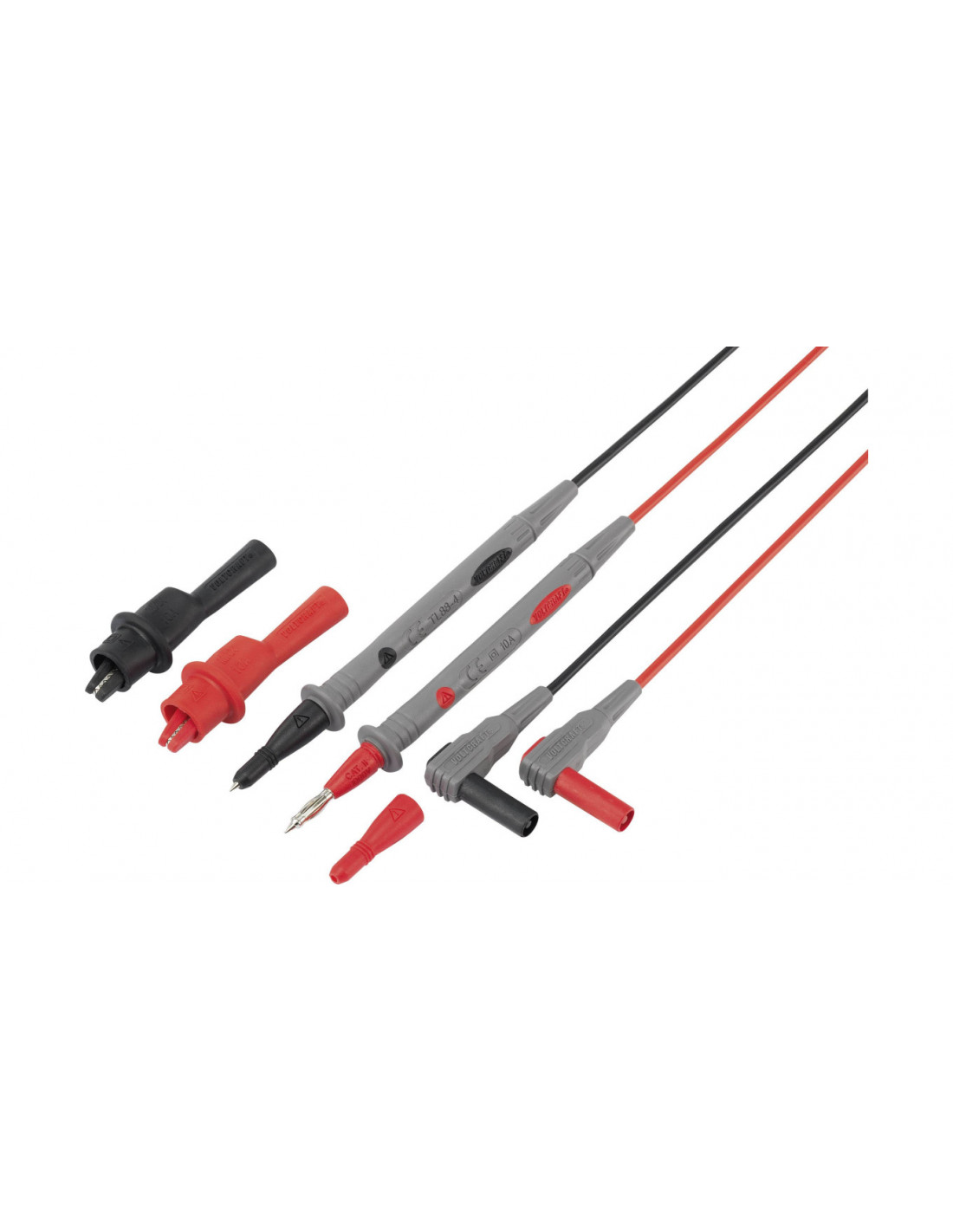 Bardzo długie przewody pomiarowe PCW o dużej swobodzie ruchu podczas pomiaru. Nadają się idealnie do multimetru. Podczas pomiarów CAT II do 1000 V z końcówek można usunąć nakładki zabezpieczające. Wtyki sprężynowe 4 mm umożliwiają pewny kontakt w gniazdkach oraz gniazdach pomiarowych. Dwukolorowa, podwójna izolacja pozwala na natychmiastowe rozpoznanie uszkodzeń na przewodach pomiarowych.