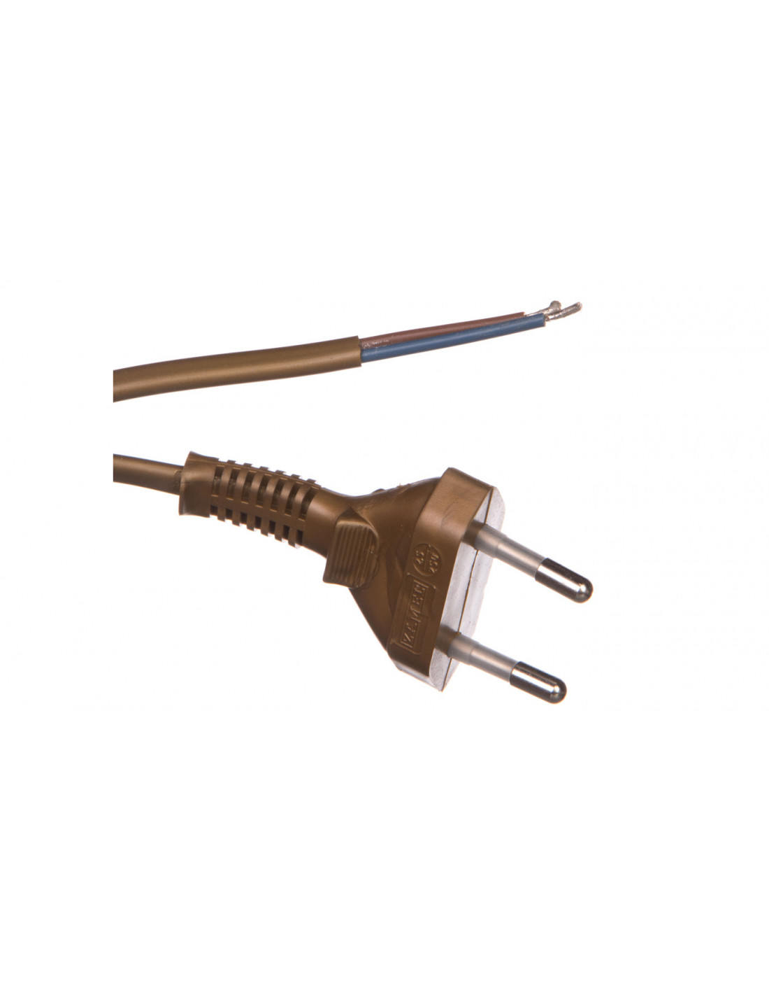 Przewód H03VVH2-F 2 x 0,75 mm2, o długości 300 cm,płaska wtyczka i łącznik nożny 2,5 A / 250 V AC z tworzywa sztucznego zamontowany 50 cm od końca przewodu. Kolor złoty.