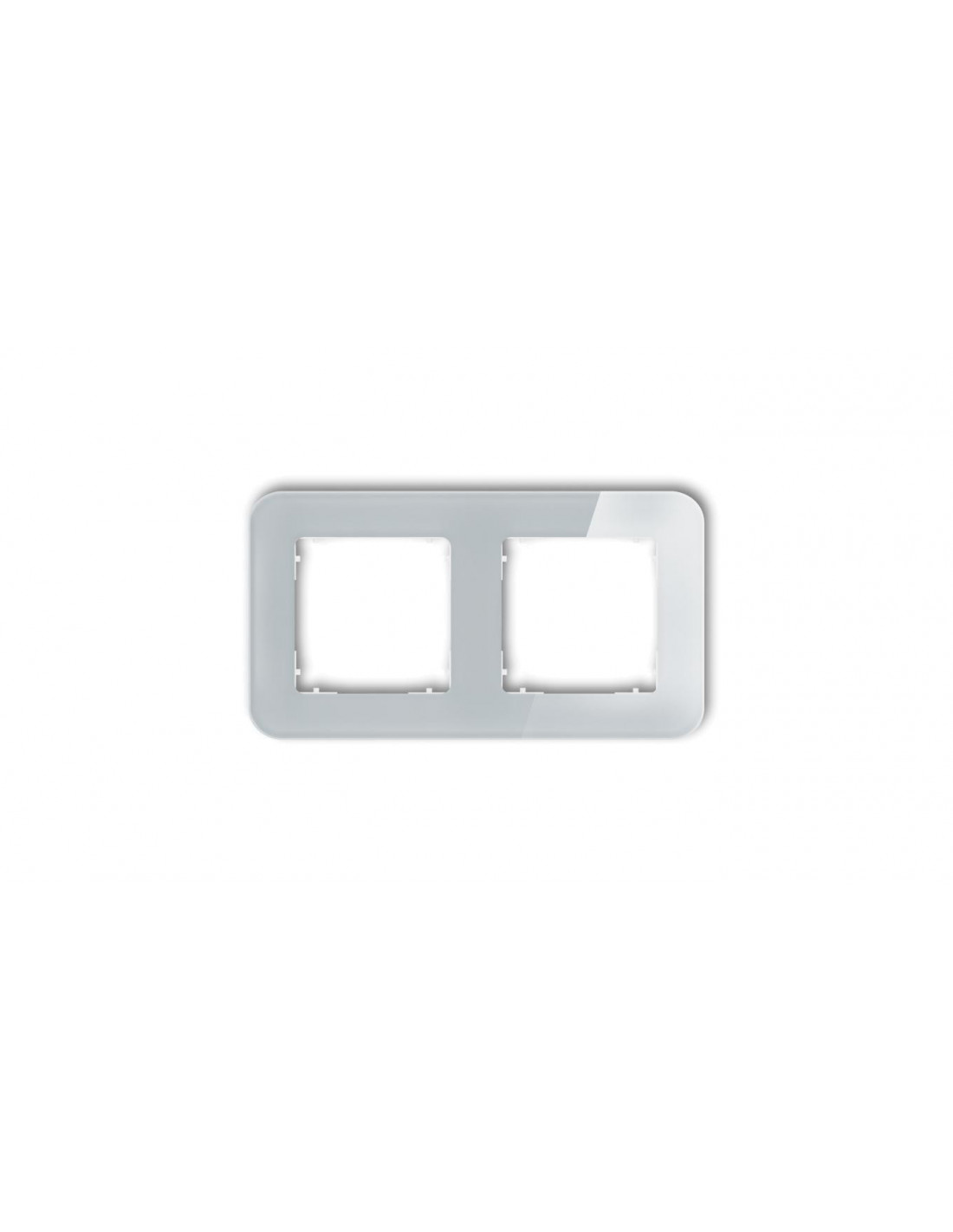 ICON Ramka uniwersalna podwójna zaokrąglona - efekt szkła (ramka: szara spód: biały) 15-0-IRSZ-2 to ramka przeznaczona do montażu dwóch modułów gniazdek elektrycznych lub przełączników światła. Jest to element estetyczny, który pomaga w kompletowaniu zestawu gniazdek czy przełączników, zapewniając schludne wykończenie oraz zabezpieczając otwarte przestrzenie na ścianie.