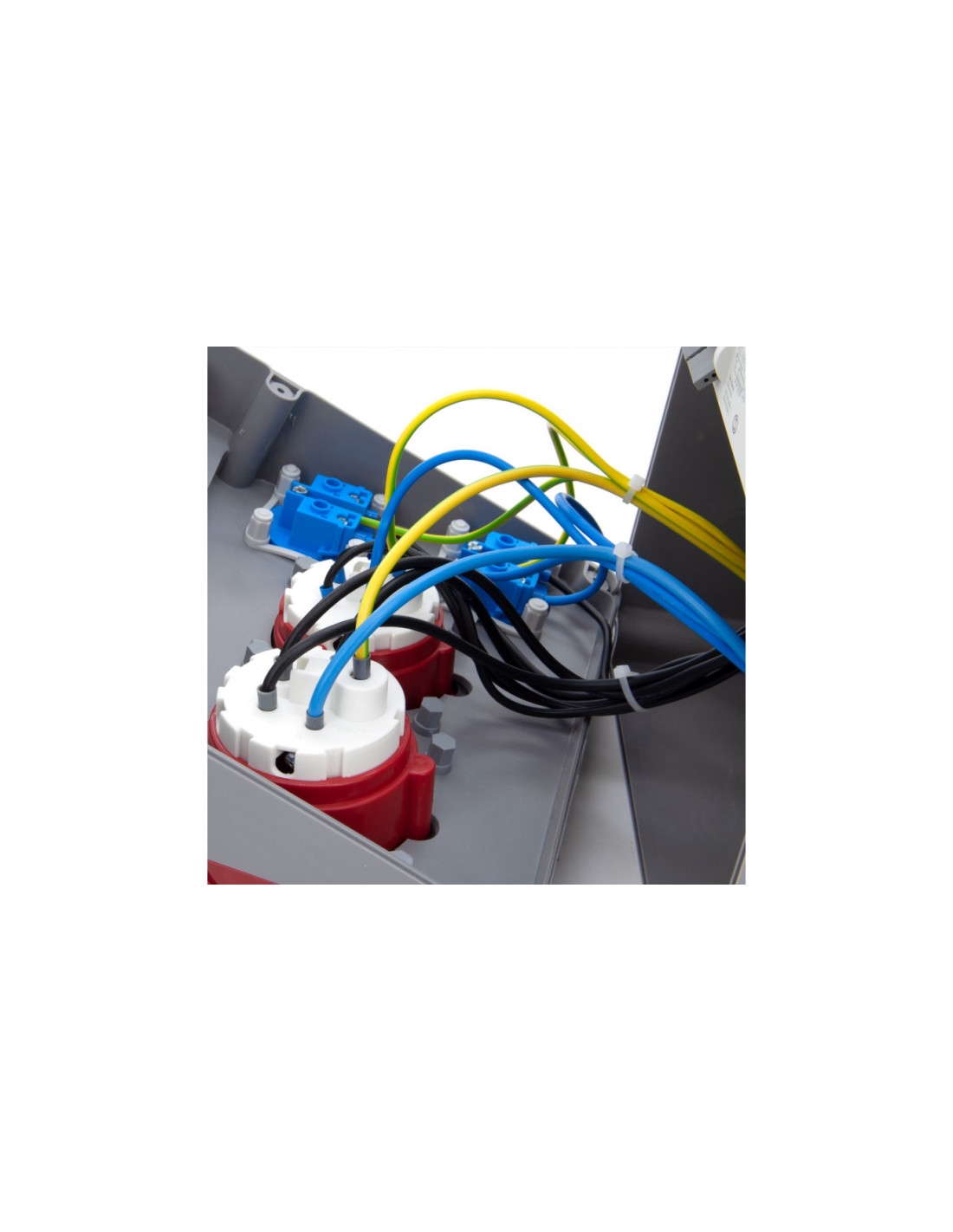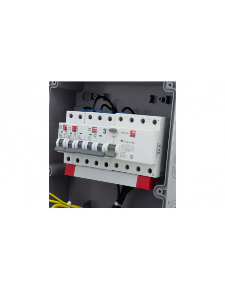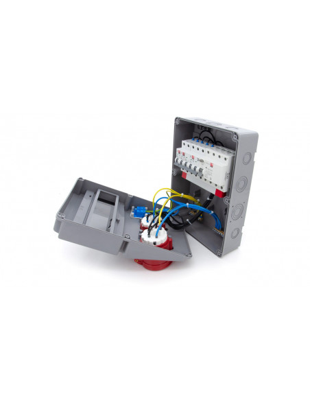1 x gniazdo 32A 5P 400V IP44, w pełni okablowane, podłączone pod wyłącznik różnicowo-prądowy FI40/4/0,03A, (zabezpieczenie gniazd ratujące życie),