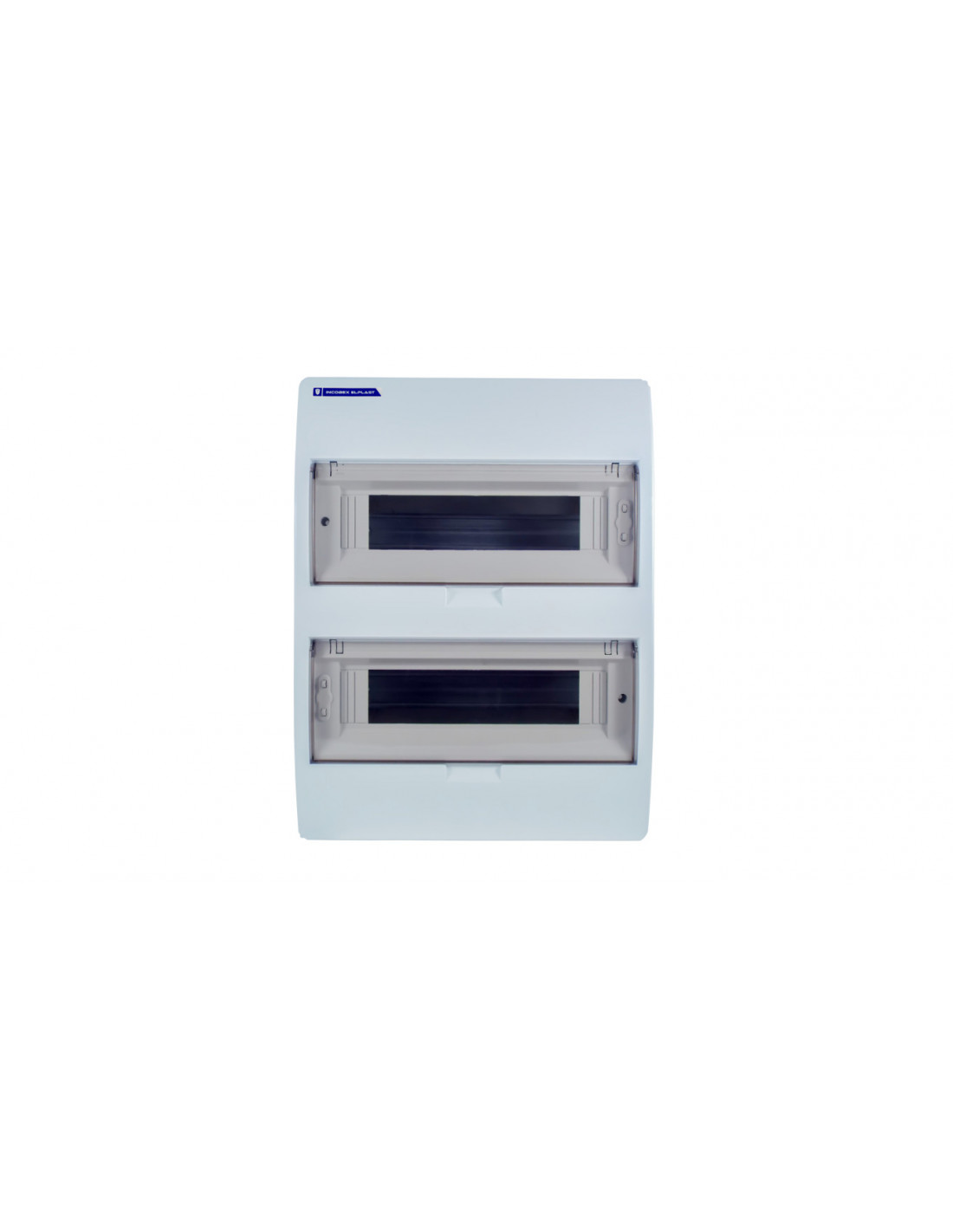 Obudowa natynkowa pod aparature modułową, dwurzędowa z miejscem na 24 moduły(2x12) przystosowana do plombowania, wykonana z tworzywa ABS charakteryzującego się wysoką odpornością mechaniczną, w kolorze białym, ze stopniem ochrony IP40 oraz napięciu znamionowym izolacji 1000V DC, posiadająca samoblokującą klapkę ochronną - otwieraną do góry, w kolorze transparentnym - dymnym, z metalową szyną TH, którą można demontować, oraz kompletem listw zaciskowych N+PE. Obudowa jest testowana i certyfikowana zgodnie z normą PN-EN 62208:2011.