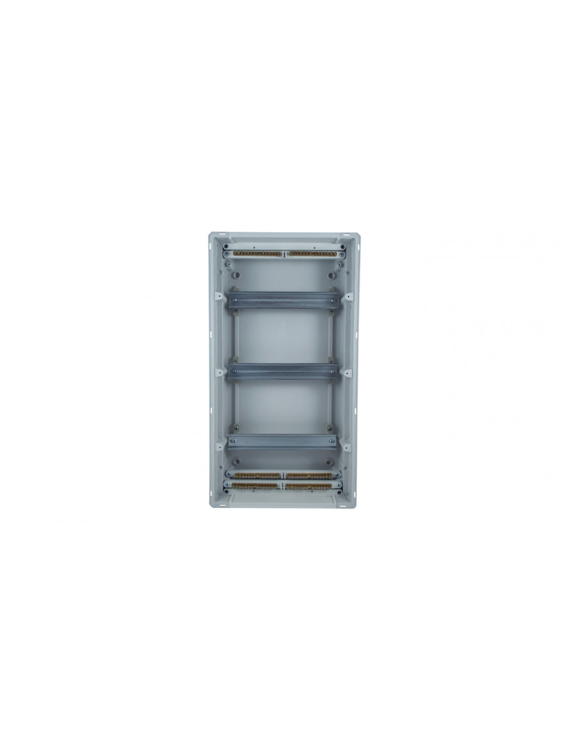 Obudowa podtynkowa pod aparature modułową, trzyrzędowa z miejscem na 36 modułów(3x12) przystosowana do plombowania, wykonana z tworzywa ABS charakteryzującego się wysoką odpornością mechaniczną, w kolorze białym, ze stopniem ochrony IP40, posiadająca samoblokującą klapkę ochronną - otwieraną do góry, w kolorze transparentnym - dymnym, z metalową szyną TH, którą można demontować, oraz kompletem listw zaciskowych N+PE. Tylni korpus zawiera demontowalne zatyczki ułatwiając wprowadzenie kabli oraz wypusty, do których można zamocować przewód przy pomocy opaski zaciskowej, przystosowany do montażu we wnęce lub do regipsów dzięki zestawowi montażowemu (Kod ENE-00397), odpowiednia głębokość zapewnia dużo miejsca dla przewodów pod szyną TH. Obudowa jest testowana i certyfikowana zgodnie z normą PN-EN 62208:2011.