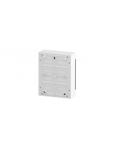 Easy9 EU to obudowa natynkowa przeznaczona do aparatury modułowej przede wszystkim w budownictwie mieszkaniowym. Zawiera 2 rzędy mieszczące 12 standardowych modułów w rozmiarze 18 mm. Można w niej umieścić wszystkie typy aparatury modułowej. Jest dostarczana z 1 uziemiającą i 1 neutralną listwą zaciskową z ich wspornikiem, a każda listwa zaciskowa ma 16 otworów (8x16mm² + 8x10mm²). Posiada odwracalne drzwi pełne w kolorze dymnym, o kącie otwarcia 180°. Kolor obudowy jest biały (RAL 9003). Obudowa dedykowana do montażu wewnątrz pomieszczeń. Stopień ochrony to IP40 przy drzwiach zamkniętych oraz IP30 przy drzwiach otwartych. W obudowie nie ma osłabień na otwory, mogą być one wykonane swobodnie za pomocą wiertarki. Miejscem przeznaczenia są nowe lub remontowane instalacje w budynkach mieszkalnych. Wewnętrzne elementy obudowy to wyjmowany stelaż z szyną DIN oraz przednia pokrywa z wycięciem. Wymiary wynoszą: (W) 256 mm x (S) 326 mm x (G) 103 mm, szerokość wyrażona w modułach 18 mm wynosi: 24, obudowa waży 1,25 kg, Obudowa wykonana jest z samogasnącego tworzywa sztucznego. Odporność na płomienie i ciepło wynosi 650°C z czasem trwania 30 min, zgodnie z normą IEC 60695-2-10. Klasa izolacji elektrycznej to klasa II (podwójna izolacja). Stopień zanieczyszczenia wynosi 2. Zgodnie z normą IEC 62262 stopień ochrony IK to IK07. Temperatura pracy wynosi od -25°C do +60°C. Temperatura przechowywania wynosi od -25°C do +70°C. Obudowa jest zgodna z normą IEC 60670-1-24.