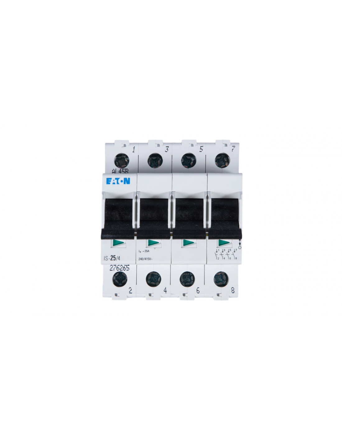 W urządzeniu napięcie znamionowe jest równe 240 V, prąd znamionowy wynosi 25 A, a wytrzymałość zwarciowa lcw ma wartość 2 kA. Rozłącznik 4-biegunowy cechuje duża odporność na ścieranie się styków, a także stopień ochrony IP40. Aparat montuje się na standardowej szynie TS 35 mm i po wbudowaniu ma on głębokość 44 mm.