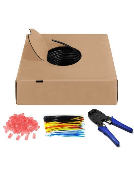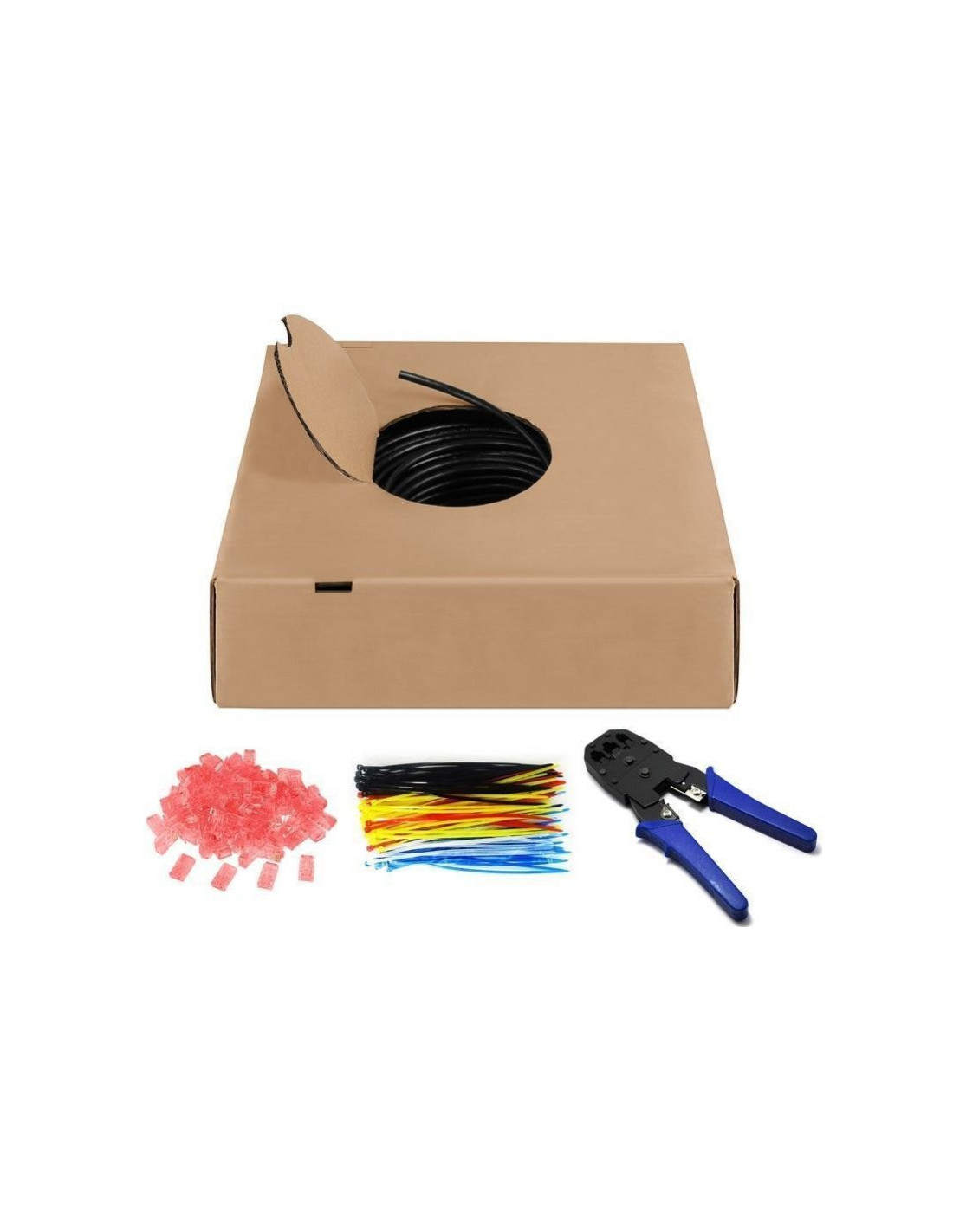 elementy składowe: kabel LAN CAT 6, szczypce zaciskowe, 100 opasek kablowych i 100 wtyków RJ45