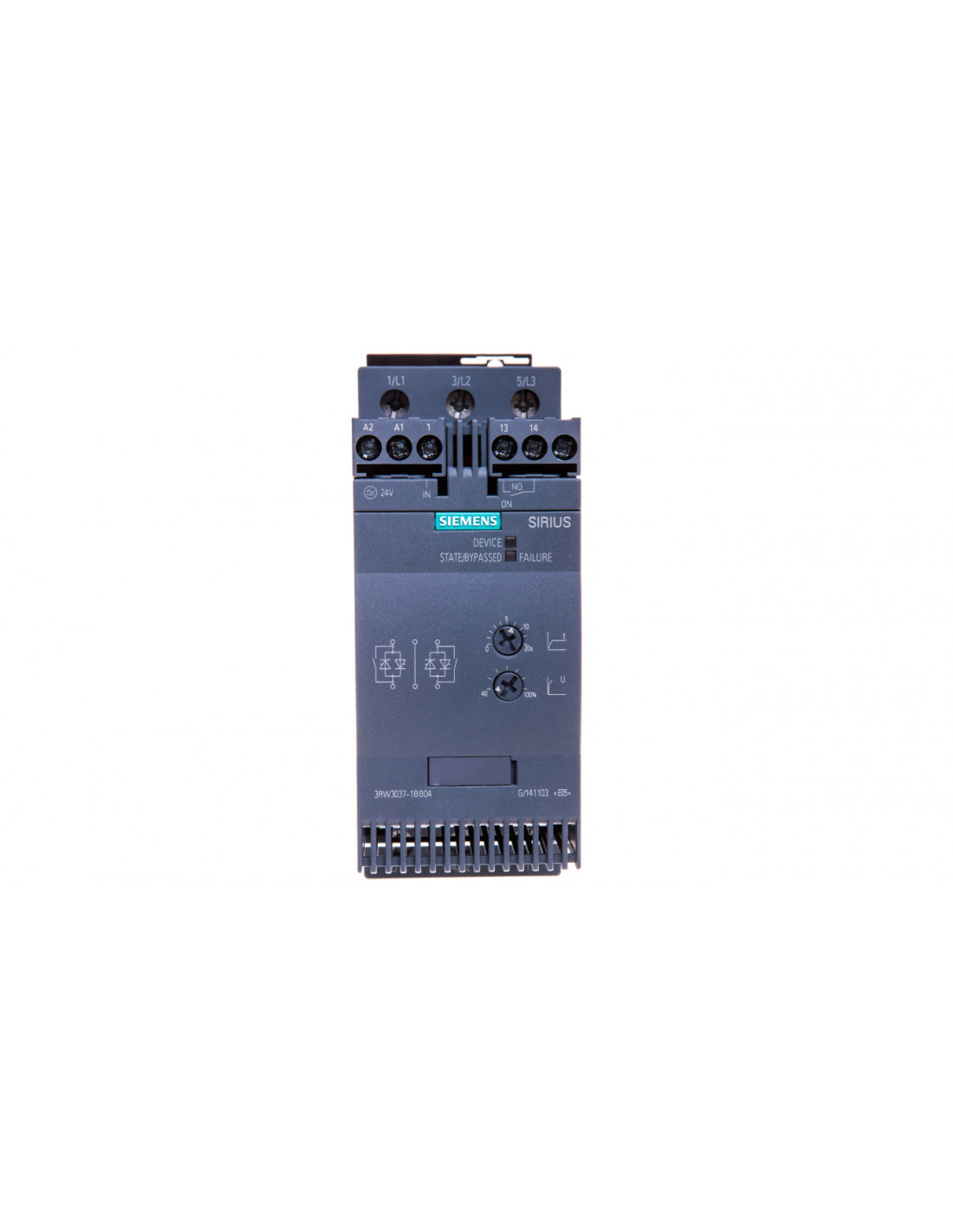 Elektroniczny softstart z linii SIRIUS posiada rozmiar S2 i stosuje się go w łagodnym rozruchu i zatrzymywaniu trójfazowych silników asynchronicznych. Dzięki specjalnej funkcji dwufazowego sterowania, prąd we wszystkich 3 fazach jest utrzymywany na najniższym poziomie podczas całego rozruchu. Ponadto, impulsowe wzrosty momentu i prądu są usuwane poprzez ciągłą regulację napięcia. Urządzenie posiada także styczniki obejściowe, które są chronione poprzez elektroniczny system gaszenia łuku, który zapobiega uszkodzeniom styków w przypadku awarii. Softstart został dostosowany do współpracy z silnikami, które są zasilane napięciem AC i DC o mocy 30 kW przy 400 V. W produkcie znamionowe napięcie sterowania Uc jest równe 24 V AC/DC. Sofstart będzie działać prawidłowo przy znamionowym napięciu roboczym z przedziału od 200 V do 480 V AC i prądzie pracy le w 40°C Tu o wartości 63 A. Urządzenie z serii SIRIUS z powodzeniem może być używane w dmuchawach, prasach, pompach hydraulicznyc, ruchomych schodach, urządzeniach transportowych oraz w przenośnikach ślimakowych. Softstart 3RW30 został zaprojektowany przez koncern SIEMENS, którego produkty są tworzone w oparciu o najnowsze rozwiązania technologiczne.