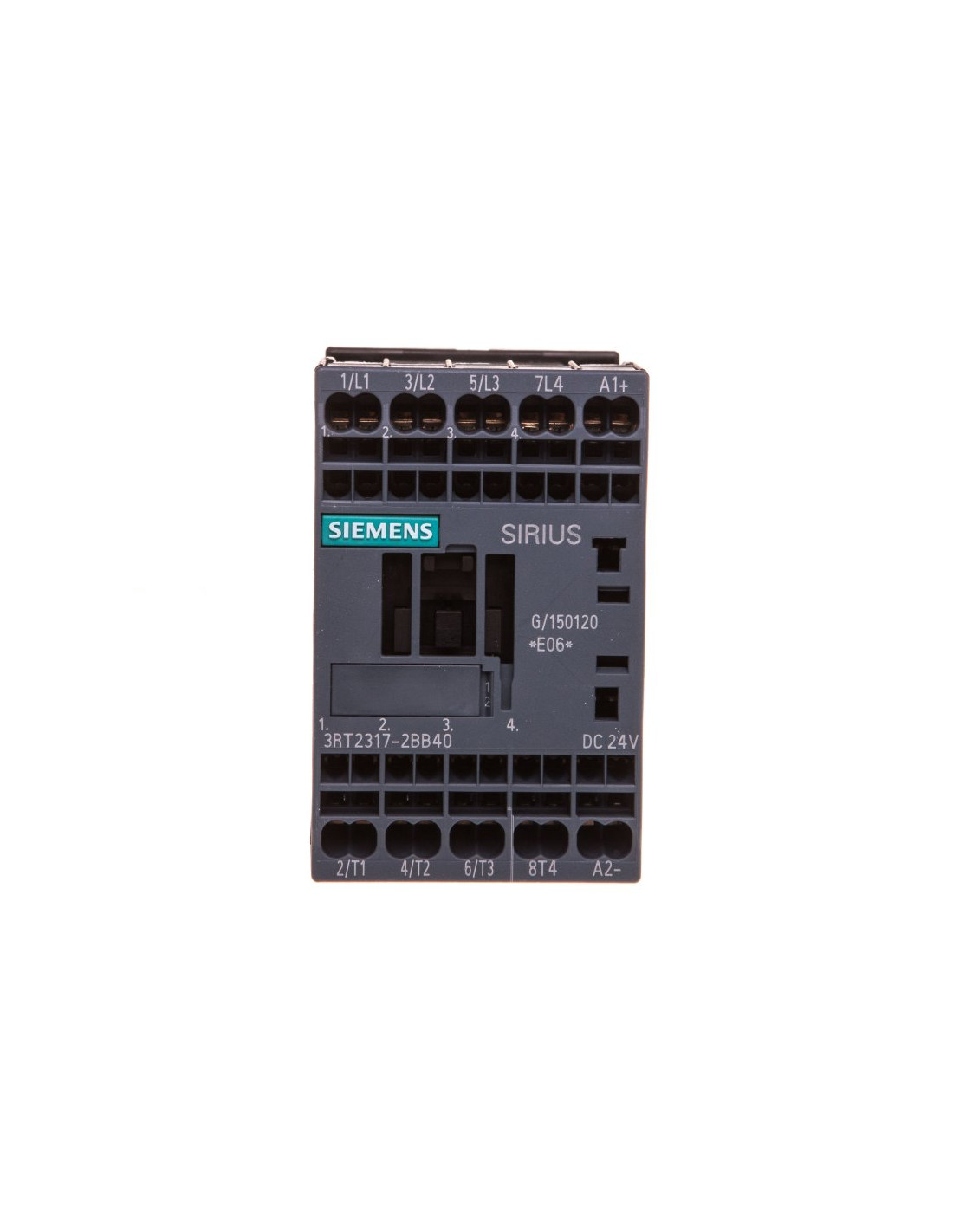 Stycznik mocy należy do serii SIRIUS producenta wysokiej jakości aparatury elektronicznej - firmy Siemens. Wszystkie elementy serii SIURIUS charakteryzują się wysoką funkcjonalnością i zwartą konstrukcją. Do serii tej należą innowacyjne wyłączniki silnikowe, przekaźniki przeciążeniowe, styczniki półprzewodnikowe, a także softstarty. 4-biegunowy stycznik o wielkości S00 posiada 4 styki główne zwierne, nie posiada styków głównych rozwiernych ani styków pomocniczych zarówno zwiernych, jak i rozwiernych. Rodzaj przyłącza obwodu głównego to połączenie śrubowe. Stycznik działa przy stałym napięciu sterowania. Znamionowe napięcie sterowania dla DC wynosi 24 V. Znamionowy prąd pracy dla AC-1 przy napięciu 400 V wynosi 22 A, a przy AC-3 przy napięciu 400 V wynosi 12 A. Znamionowa moc pracy przy AC-3 przy napięciu 400 V to 5.5000 kW. Stycznik wykorzystuje się do załączania silników. Stycznik można wykorzystać do rozruchu napędów w układzie nawrotnym lub gwiazda-trójkąt, przyłączając moduły funkcyjne. Można je także wyposażyć w interfejs AS-i lub IO-Link, zmniejszając liczbę przewodów sterowniczych.