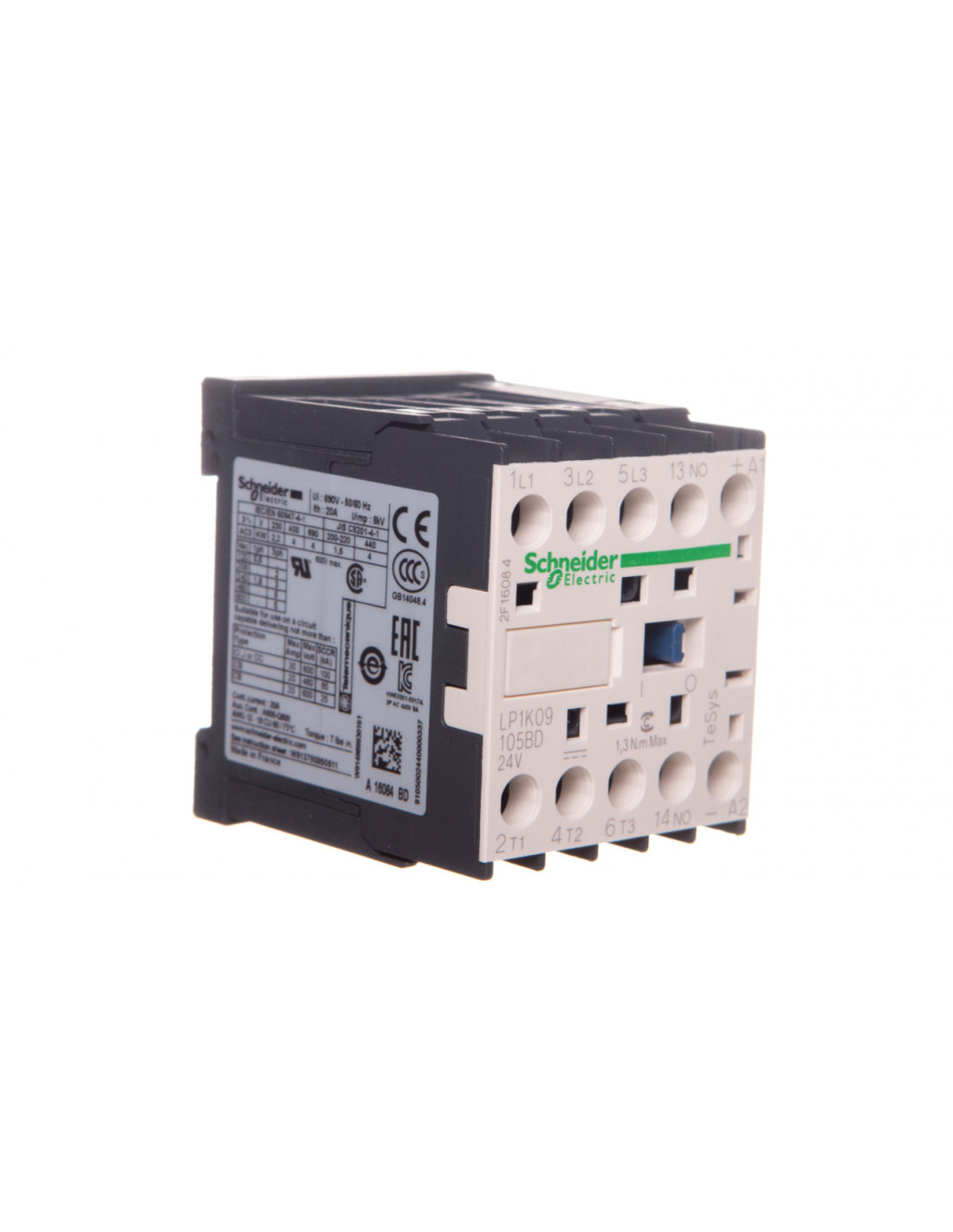 Stycznik mocy miniaturowy I=9A [AC-3], styk pom. 1 NO, nap. cewki 24 V DC. Zakres: TeSys - typ produktu: stycznik - opis skrócony: LP1K - zastosowanie: obciążenie rezystancyjne, sterowanie silnikiem - Kategoria użytkowania: AC-1, AC-3, AC-4 - liczba biegunów: 3P - kombinacja styków: 3 NO - [Ue] znamionowe napięcie pracy: = 15 s obwód mocy, 40 A kompaktowość i perfekcyjną integrację we wszystkich twoich aplikacjach.... Zastosowanie: - Przemysł, infrastruktura, budownictwo, itd., Proste systemy sterowania., Strefy wrażliwe na hałas, rozproszone zasilania sieciowe: cichy stycznik., Kompatybilny z wyjściami sterowników programowalnych: stycznik o małym poborze mocy..
