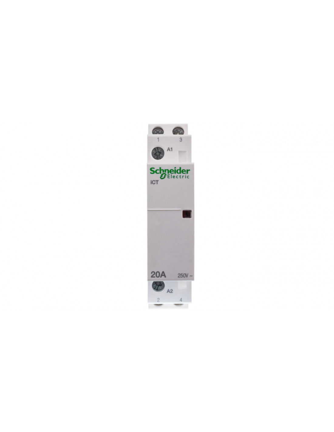 Dany stycznik modułowy znajduje się w serii ACTI 9 marki SCHNEIDER ELECTRIC. Posiada dwa styki zwierne oraz dwa moduły. Wbudowana głębokość tego stycznika wynosi 68 mm. Maksymalna zdolność łączeniowa dla świetlówek (kompensacja DUO) wynosi 1500 VA, natomiast maksymalna zdolność łączeniowa dla świetlówek (z kompensacją równoległą) wynosi 800 VA. IP20 to stopień ochrony stycznika. Świadczy on o ochronie przed ciałami obcymi o średnicy 12,5 mm. Nie będzie można wystawiać go na warunki zewnętrzne. Kategoria użytkowania została oznaczona na AC-7. Znamionowe napięcie cewki wynosi 230 V. Znamionowe napięcie pracy dochodzi do 250 V, a znamionowy prąd pracy może osiągnąć 20 A. Stycznik nie posiada suwaka do obsługi manualnej. Istnieje możliwość na dodatkowe wyposażenie przy tym urządzeniu. Maksymalna zdolność łączeniowa dla świetlówek wynosi 850 VA, a maksymalna zdolność łączeniowa dla żarówek - 2100. SCHNEIDER specjalizuje się w dystrybucji typu ultraterminal, ale również w automatyce, sterowaniu przemysłowym i produkcji czujników maszyn seryjnych.