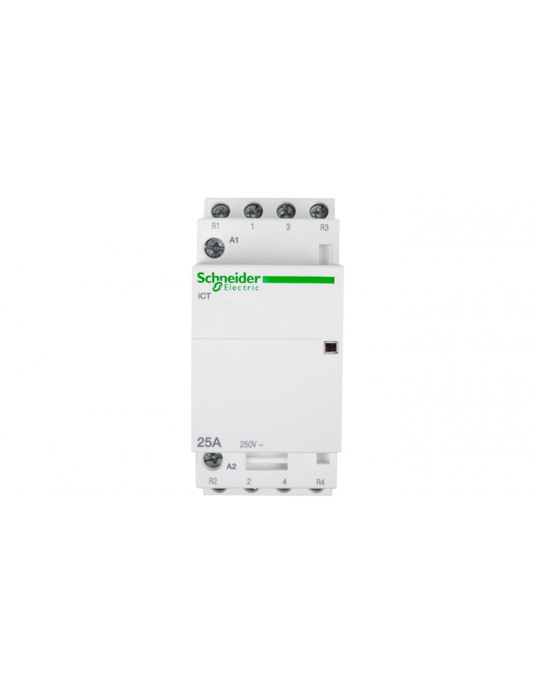 Światowy producent SCHNEIDER ELECTRIC posiada swoja siedzibę we Francji. Od 1836 roku zbiera doświadczenie, dzięki któremu stał się jednym z liderów na rynku rozdziału energii elektrycznej. Ten posiada po dwa styki zwierne i rozwierne. Wbudowana głębokość tego stycznika wynosi 68 mm. Kategoria użytkowania została oznaczona na AC-7. Maksymalna zdolność łączeniowa dla świetlówek wynosi 1200 VA, a maksymalna zdolność łączeniowa dla żarówek - 3000 W. Stopień ochrony jakim się charakteryzuje to IP20. Świadczy on o ochronie przed ciałami obcymi o średnicy 12,5 mm. Stycznik nie jest chroniony przed działaniem wody oraz przed innymi warunkami atmosferycznymi. Znamionowe napięcie cewki wynosi 230 V. Znamionowe napięcie pracy dochodzi do 400 V, a znamionowy prąd pracy może osiągnąć 25 A. Stycznik nie posiada suwaka do obsługi manualnej. Maksymalna zdolność łączeniowa dla świetlówek (kompensacja DUO) wynosi 2400 VA, natomiast maksymalna zdolność łączeniowa dla świetlówek (z kompensacją równoległą) wynosi 1200 VA. Istnieje możliwość dodatkowego wyposażenia stycznika.