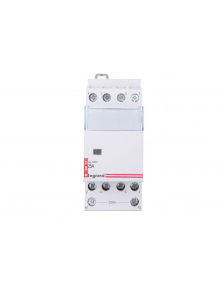 LEGRAND POLSKA jest częścią międzynarodowego koncernu, GRUPY LEGRAND, eksperta w zakresie produktów i systemów instalacji elektrycznych oraz sieci informatycznych w budownictwie mieszkaniowym, komercyjnym i przemysłowym. Wszystkie produkty spełniają wymogi norm, posiadają atesty i międzynarodowe certyfikaty potwierdzające ich wysoką jakość. Powyższy stycznik modułowy posiada cztery styki rozwierne i ma szerokość dwóch modułów. Głębokość wbudowania wynosi 44 mm. Stycznik nie posiada manipulatora do obsługi manualnej. Zarówno napięcie sterowania jak i zasilania wykorzystuje prąd zmienny. Znamionowe napięcie cewki w tym styczniku dochodzi do 230 V, natomiast znamionowe napięcie pracy dochodzi do 400 V. Stopień ochrony IP2X. Znamionowy prąd pracy może dojść do 25 A. Maksymalna zdolność łączeniowa dla świetlówek wynosi 1540 VA (z kompensacją równoległą 980 VA), natomiast maksymalna zdolność łączeniowa dla żarówek wynosi 3000 W. Kategoria użytkowania została określona na AC-1. Istnieje możliwość dodatkowego wyposażenia urządzenia w styk pomocniczy.