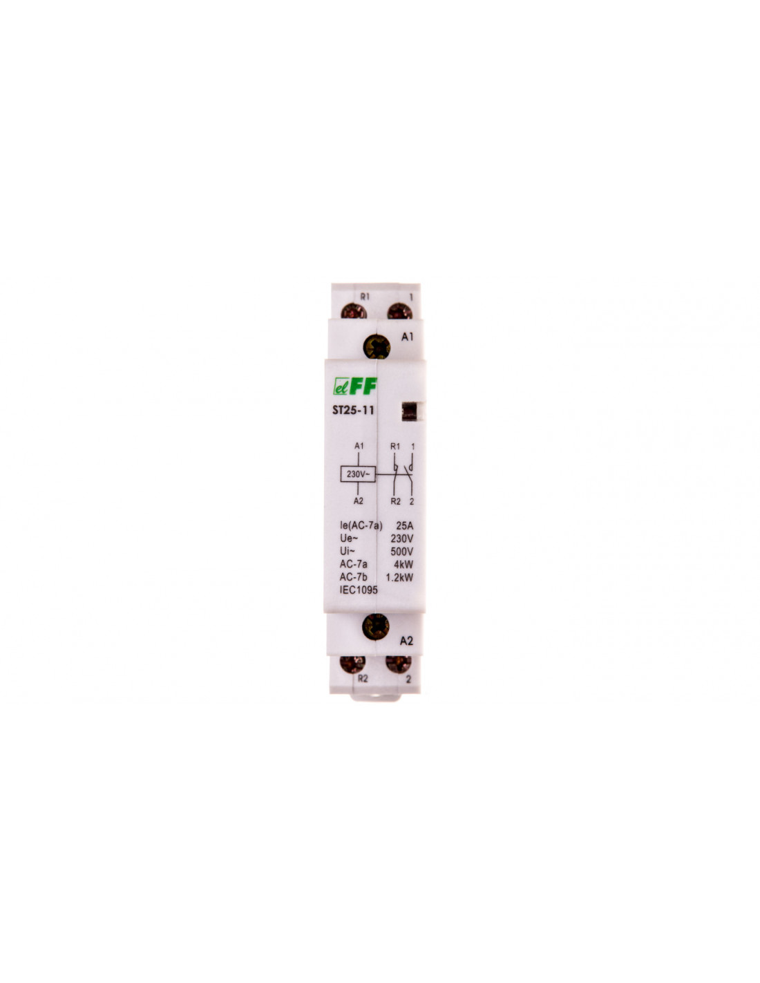 F&F jest jedną z wiodących firm na polskim rynku, które specjalizują się w wytwarzaniu elektronicznego sprzętu sterowniczego. Koncern rozpoczął swoją działalność w 1992 roku i od tamtej pory współpracuje ze środowiskiem naukowym oraz z klientami, aby jeszcze bardziej przybliżyć swoje produkty do pożądanego przez klientów ideału. Jednym z produktów tej marki jest stycznik modułowy, którego powyższa wersja posiada jeden moduł oraz po jednym styku zwiernym i rozwiernym. Kategorię użytkowania AC w tym przypadku określono jako 1. Głębokość wbudowania produktu wynosi 67 mm. Stopień ochrony określono jako IP20, co oznacza, że urządzenie to nie jest wystarczająco odporne na wpływ wilgoci, kurzu i pyłu. Czynniki te mogłyby zmniejszyć wydajność pracy stycznika. Prezentowany tutaj model prawidłowo działa przy zmiennym napięciu sterowania, którego wartość, podobnie jak wartość napięcia cewki, wynosi 230 V. Znamionowy prąd pracy jest tu równy 25 A.