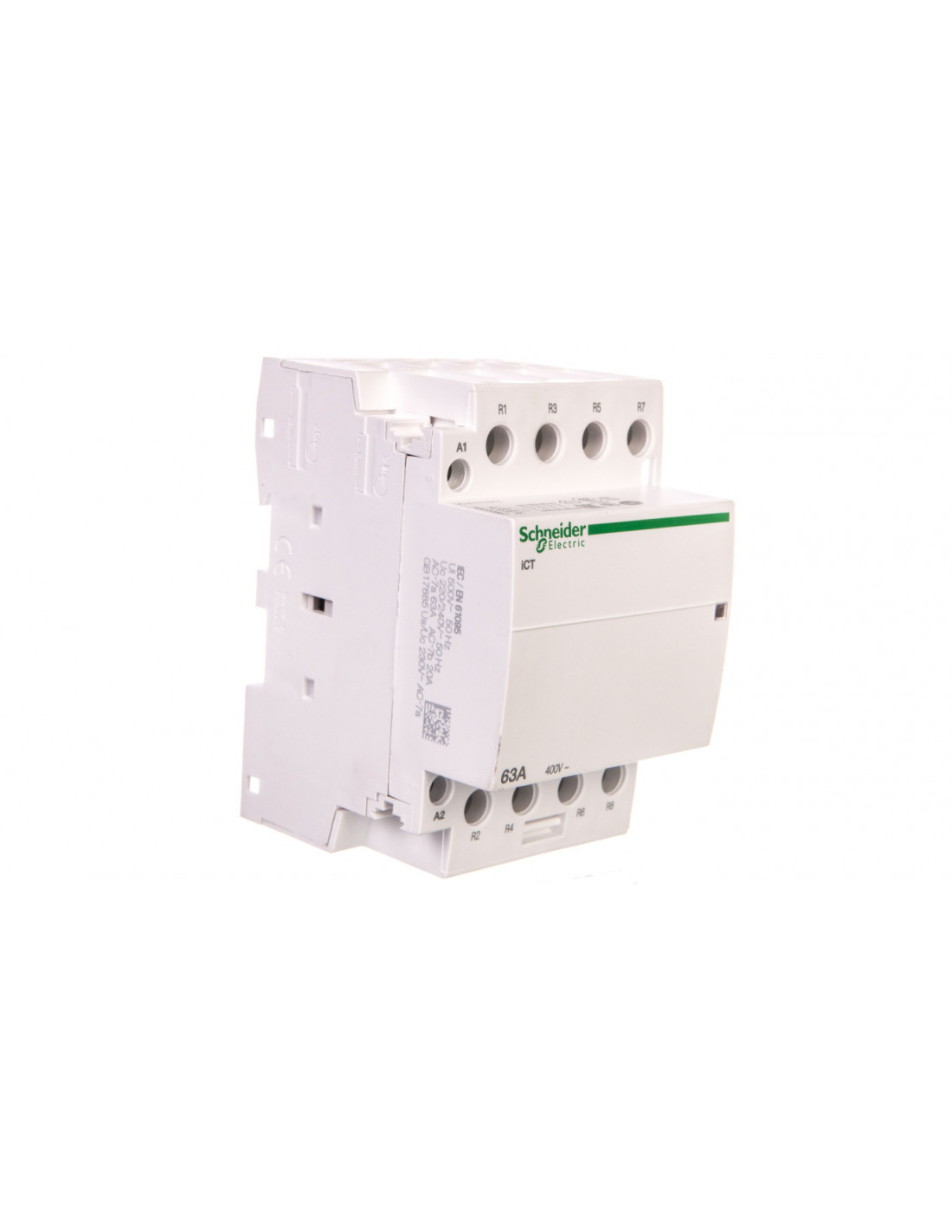 Stycznik modułowy iCT 63A 4NZ 220...240 V 50 Hz. zastosowanie: silnik-ogrzewanie-oświetlenie - rodzina produktów: iCT - typ produktu: stycznik - opis skrócony: iCT - liczba biegunów: 4P - kombinacja styków: 4 NZ - rodzaj sieci: AC - Kategoria użytkowania: AC-1 zgodnie z EN 60947-4-1, AC-3 zgodnie z EN 60947-4-1, AC-5A zgodnie z EN 60947-4-1, AC-5B zgodnie z EN 60947-4-1, AC-7A zgodnie z EN 61095, AC-7A zgodnie z IEC 1095, AC-7B zgodnie z EN 61095, AC-7B zgodnie z IEC 1095 - typ sterowania: zdalne sterowanie. Zalety: Efektywność na którą zasługijesz, Łatwy dobór wśród jedno- do czteropolowych styczników o szerokim zakresie prądów znamionowych zgodnych z wymaganiami norm DIN, Satysfakcjonujący kompletny system modułowy, Elastyczne zestawienia wyposażenia pomocniczego o prostym systemie mocowania zatrzaskowego, Współpracuje z wszystkimi produktami Acti 9.... Zastosowanie: - Monitorowanie i sterowanie obwodami elektrycznymi w budownictwie przemysłowym, powszechnym i mieszkaniowym, Monitorowanie i sterowanie obwodami odbiorczymi odbiorników jedno- i trójfazowych o poborze prądu do 100A., Łączenie między sterownicą i obwodami głównymi dla sterowania obwodami odbiorczymi takimi jak: oświetlenie, ogrzewanie, rolety, system wodny, piece, małe silniki, wentylatory, pompy cieplne itp....