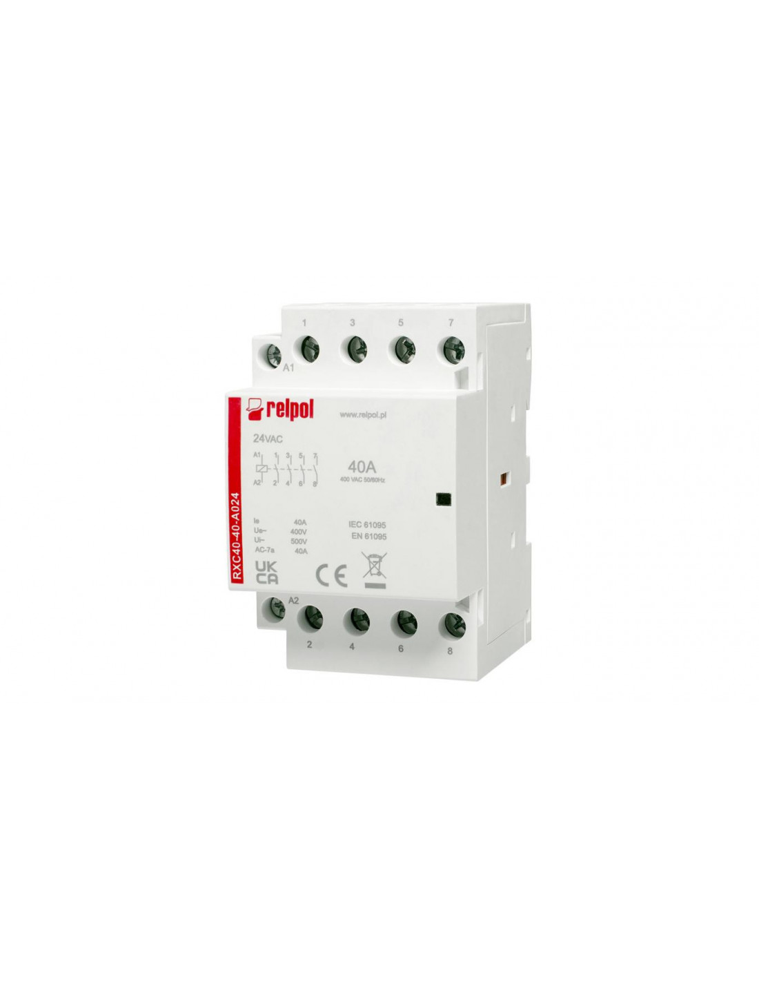 Stycznik instalacyjny 4-biegunowy 4N/O 40A 250VAC; Cewka: 24VAC Wymiary: 85 x 54 x 67 mm. Montaż na szynie 35 mm. IP 20.
