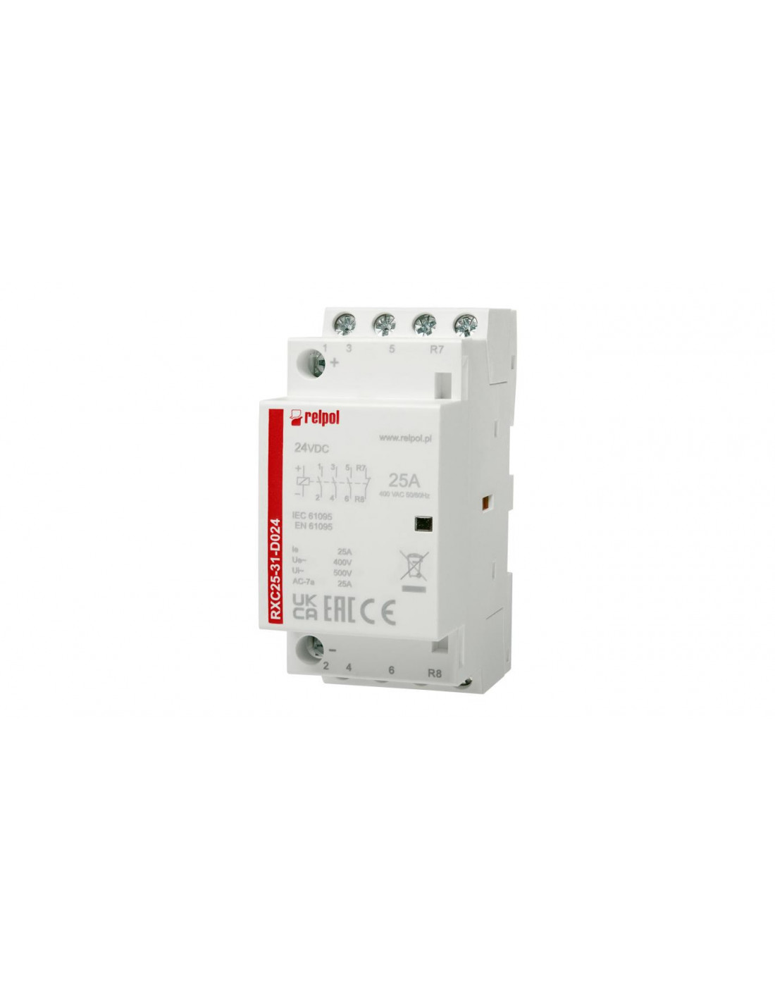 Stycznik instalacyjny 4-biegunowy 3N/O+1N/Z 25A 250VAC; Cewka: 24VDC Wymiary: 81 x 36 x 67 mm. Montaż na szynie 35 mm. IP 20.
