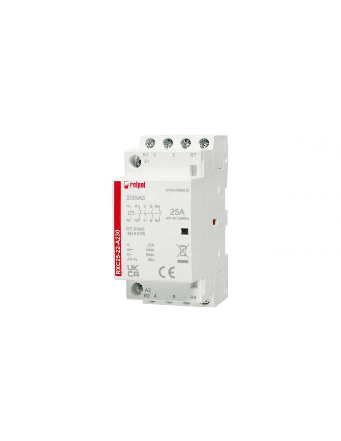 Stycznik instalacyjny 4-biegunowy 2N/O+2N/Z 25A 250VAC; Cewka: 230VAC Wymiary: 81 x 36 x 67 mm. Montaż na szynie 35 mm. IP 20.