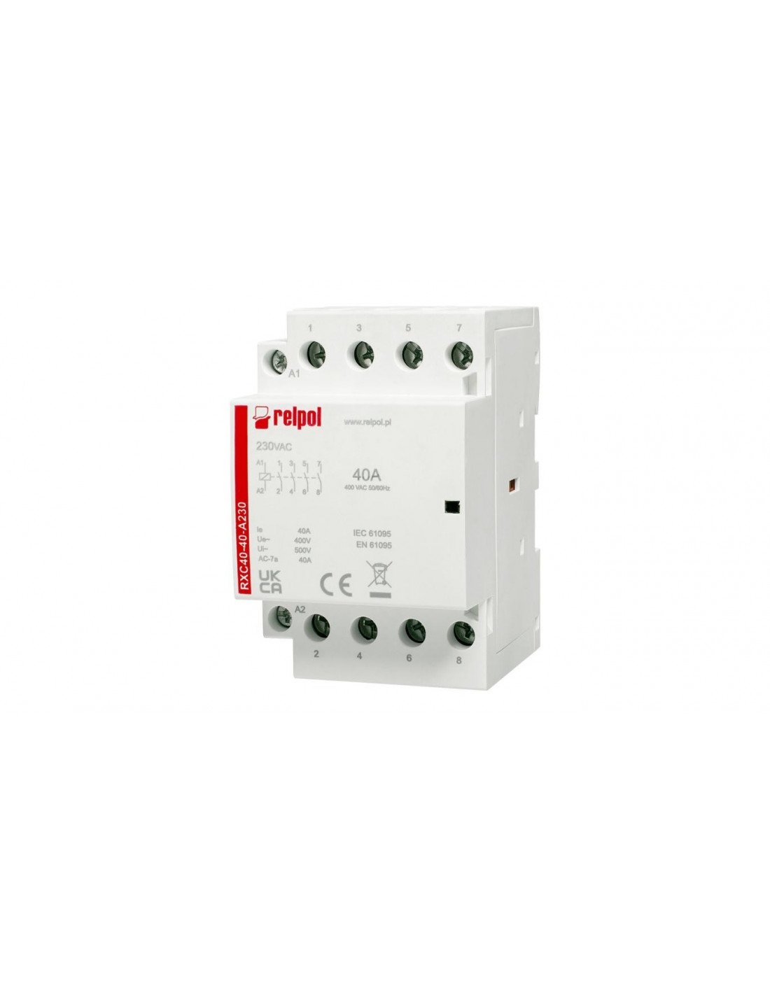 Stycznik instalacyjny 4-biegunowy 4N/O 40A 250VAC; Cewka: 230VAC Wymiary: 85 x 54 x 67 mm. Montaż na szynie 35 mm. IP 20.