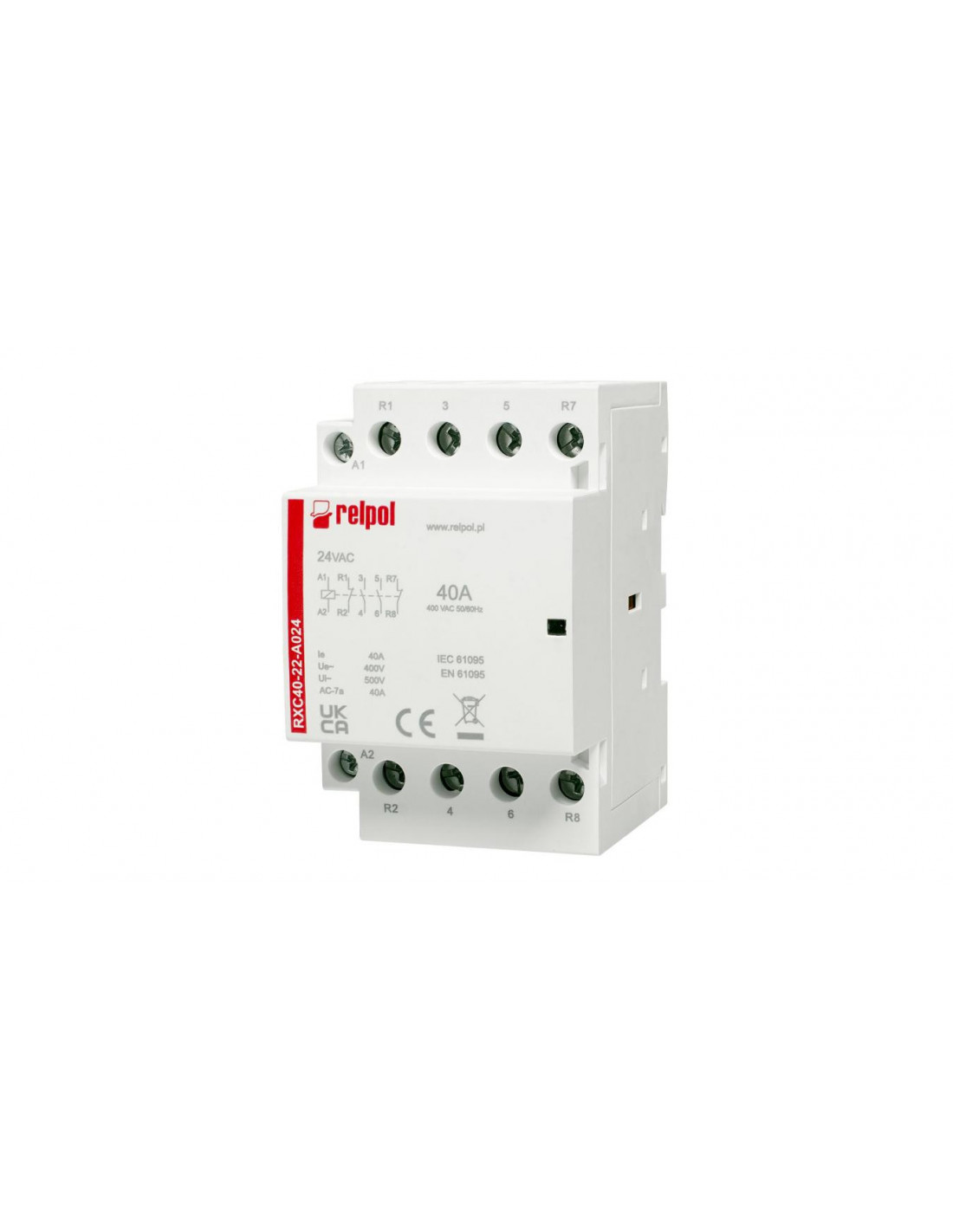 Stycznik instalacyjny 4-biegunowy 2N/O+2N/Z 40A 250VAC; Cewka: 24VAC Wymiary: 85 x 54 x 67 mm. Montaż na szynie 35 mm. IP 20.