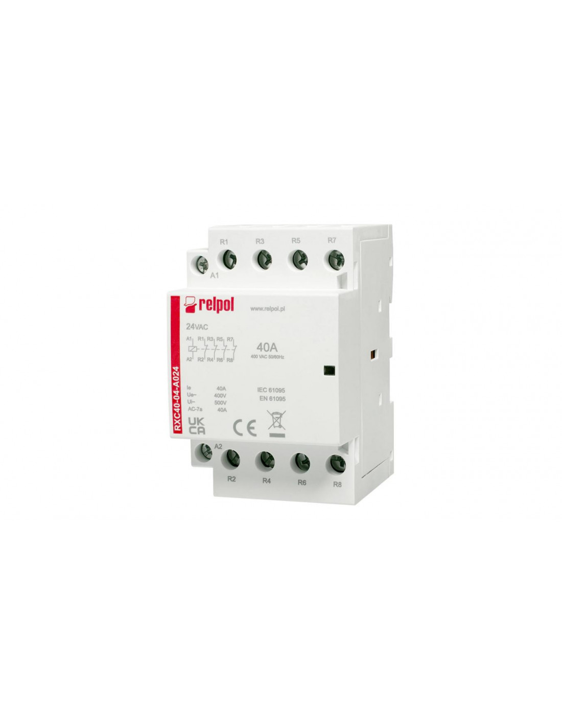 Stycznik instalacyjny 4-biegunowy 4N/Z 40A 250VAC; Cewka: 24VAC Wymiary: 85 x 54 x 67 mm. Montaż na szynie 35 mm. IP 20.