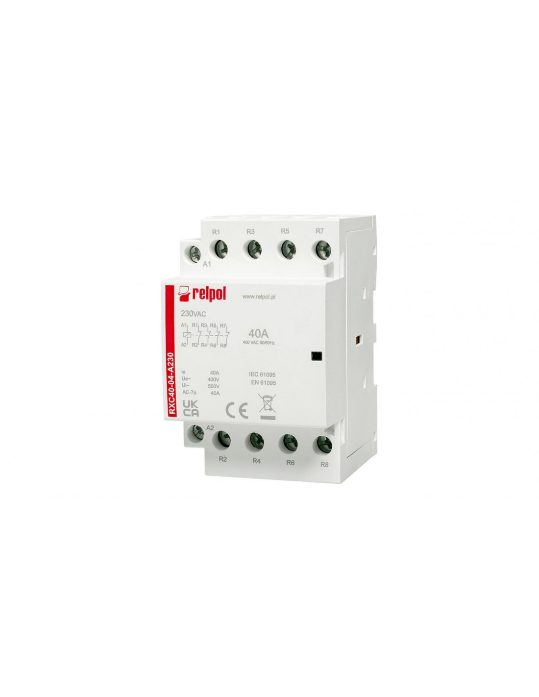 Stycznik instalacyjny 4-biegunowy 4N/Z 40A 250VAC; Cewka: 230VAC Wymiary: 85 x 54 x 67 mm. Montaż na szynie 35 mm. IP 20.