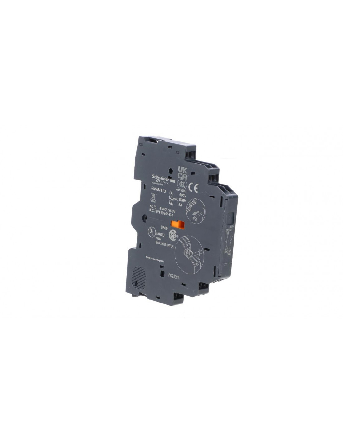 Blok styków pomocniczych do wyłącznika silnikowego GV2 i GV3, 1 NO+1 NC. Zakres: TeSys - opis skrócony: GVAN - typ produktu: dodatkowy blok styków - kompatybilność produktu: GV2L, GV2LE, GV2ME, GV2P, GV2RT, GV3L, GV3P - kombinacja styków: 1 NO + 1 NZ - rodzaj zacisków: Obwody sterowania: zaciski sprężynowe 1 przewód 0.75...2.5 mm2 - sztywność kabla: giętki - bez końcówka przewodu, Obwody sterowania: zaciski sprężynowe 2 przewód 0.75...2.5 mm2 - sztywność kabla: giętki - bez końcówka przewodu. Zalety: Kompletna ochrona