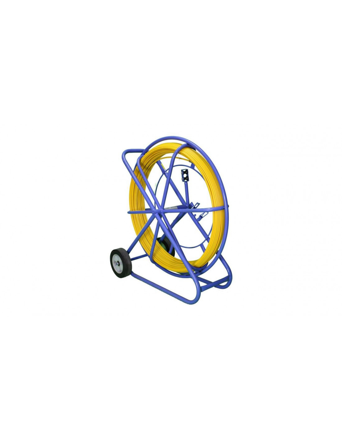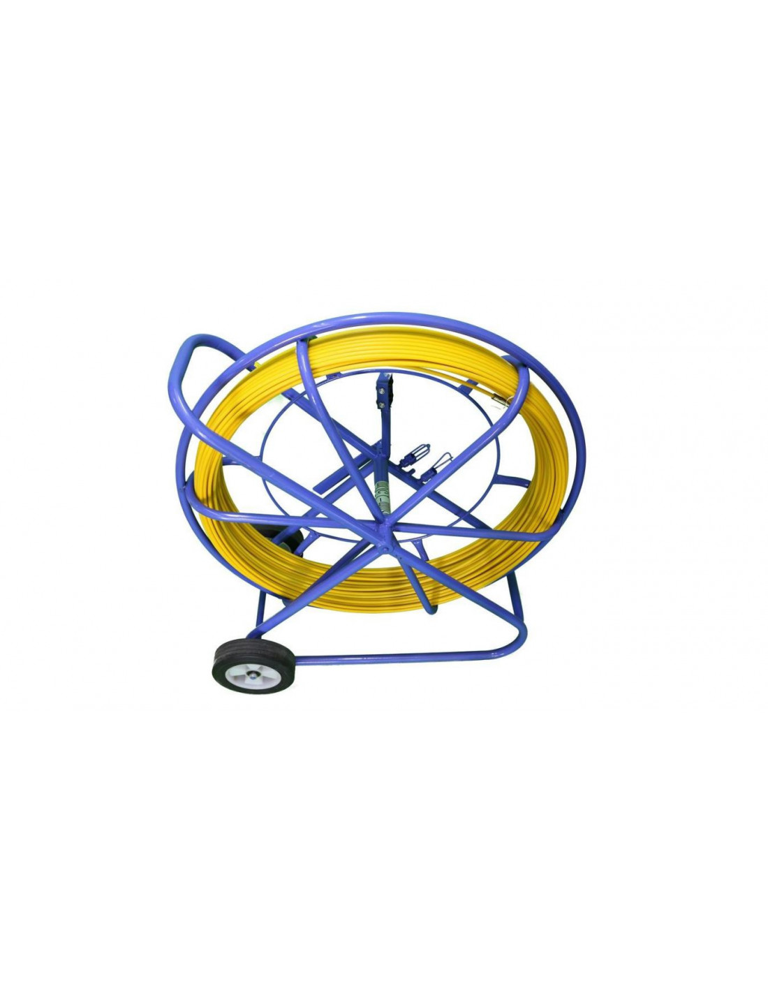 Pilot do przeciągania kabli Extralink 10mm 250m Pilot do przeciągania kabli wykonany z włókna szklanego FRP o średnicy 10 mm i długości 250 metrów umieszczonego na specjalnym stojaku ułatwiającym jego rozwinięcie. Włókno o wysokiej sprężystości i wytrzymałości na zaginanie i zrywanie, pokryte żółtym tworzywem sztucznym PE pełniącym funkcję ochronną i zapewniającym dobre cechy poślizgowe. Stelaż na włókno malowany proszkowo w kolorze niebieskim, wyposażony w ręczny hamulec blokujący bęben, oraz specjalne "oczko" do prowadzenia włókna. Konstrukcja stojaka zapewnia funkcjonalny transport, przechowywanie, oraz samo użytkowanie. Końcówka włókna zakończona głowicą prowadzącą Zastosowanie: Przeciąganie przewodów między studzienkami teletechnicznymi Przepychanie kabli pod drogami Instalacje w sufitach podwieszanych Czyszczenie, udrażnianie rur, przepustów, kanalizacji Wprowadzanie kabli do rur osłonowych