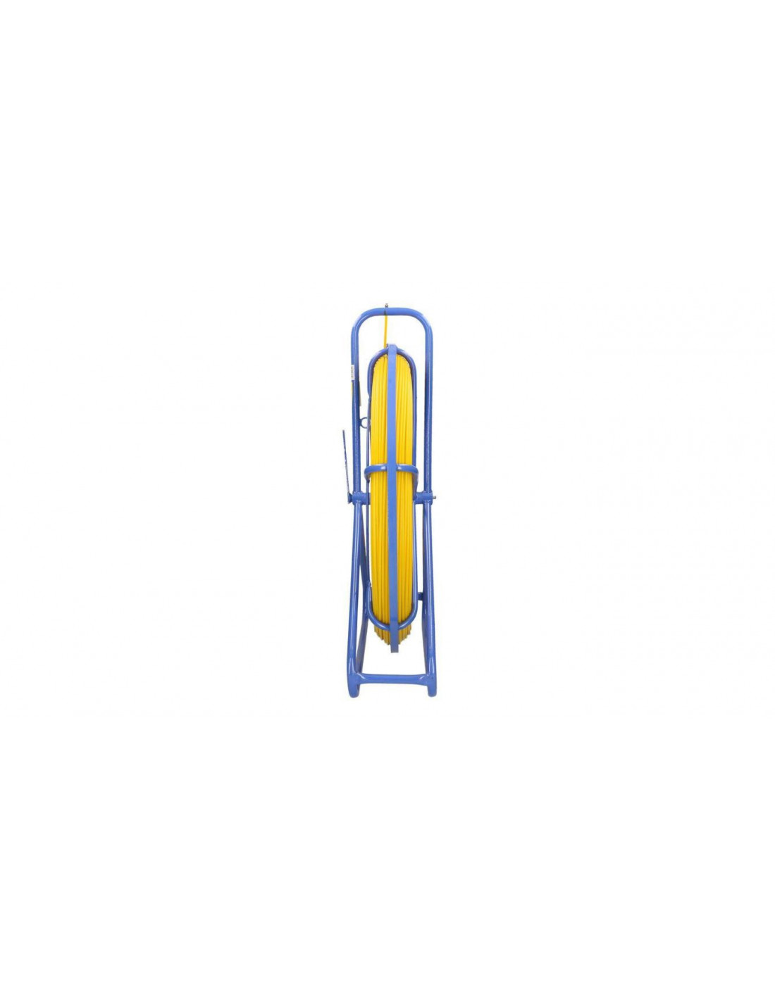 Pilot do przeciągania kabli Extralink 4.5mm 75m Pilot do przeciągania kabli wykonany z włókna szklanego FRP o średnicy 4,5 mm i długości 75 metrów umieszczonego na specjalnym stojaku ułatwiającym jego rozwinięcie. Włókno o wysokiej sprężystości i wytrzymałości na zaginanie i zrywanie, pokryte żółtym tworzywem sztucznym PE pełniącym funkcję ochronną i zapewniającym dobre cechy poślizgowe. Stelaż na włókno malowany proszkowo w kolorze niebieskim, wyposażony w ręczny hamulec blokujący bęben, oraz specjalne "oczko" do prowadzenia włókna. Konstrukcja stojaka zapewnia funkcjonalny transport, przechowywanie, oraz samo użytkowanie. Końcówka włókna zakończona głowicą prowadzącą Zastosowanie: Przeciąganie przewodów między studzienkami teletechnicznymi Przepychanie kabli pod drogami Instalacje w sufitach podwieszanych Czyszczenie, udrażnianie rur, przepustów, kanalizacji Wprowadzanie kabli do rur osłonowych