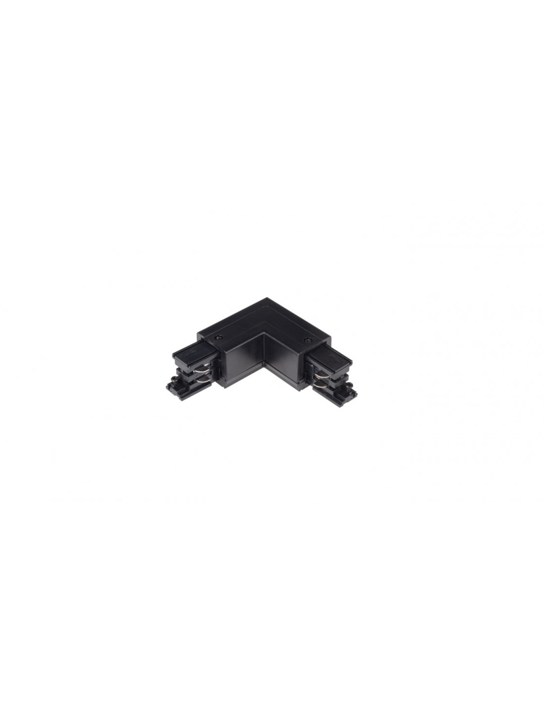Łącznik narożny z wtykami R i L przeznaczony do montażu na kształt litery "L" dwóch odcinków szynoprzewodu pod kątem prostym; kolor czarny.