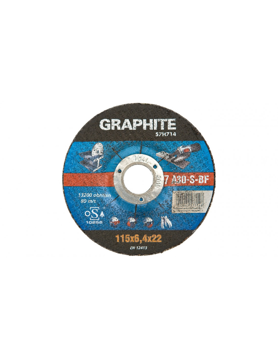 Tarcza do szlifowania metalu GRAPHITE (nr ref. 57H715) o średnicy zewnętrznej 125 mm, posiada bardzo wysoką odporność na uszkodzenia w trakcie pracy dzięki zastosowaniu potrójnej warstwy siatek wzmacniających. Zapewnia wysoki poziom bezpieczeństwa pracy dzięki zgodności produktu z normą EN12413.